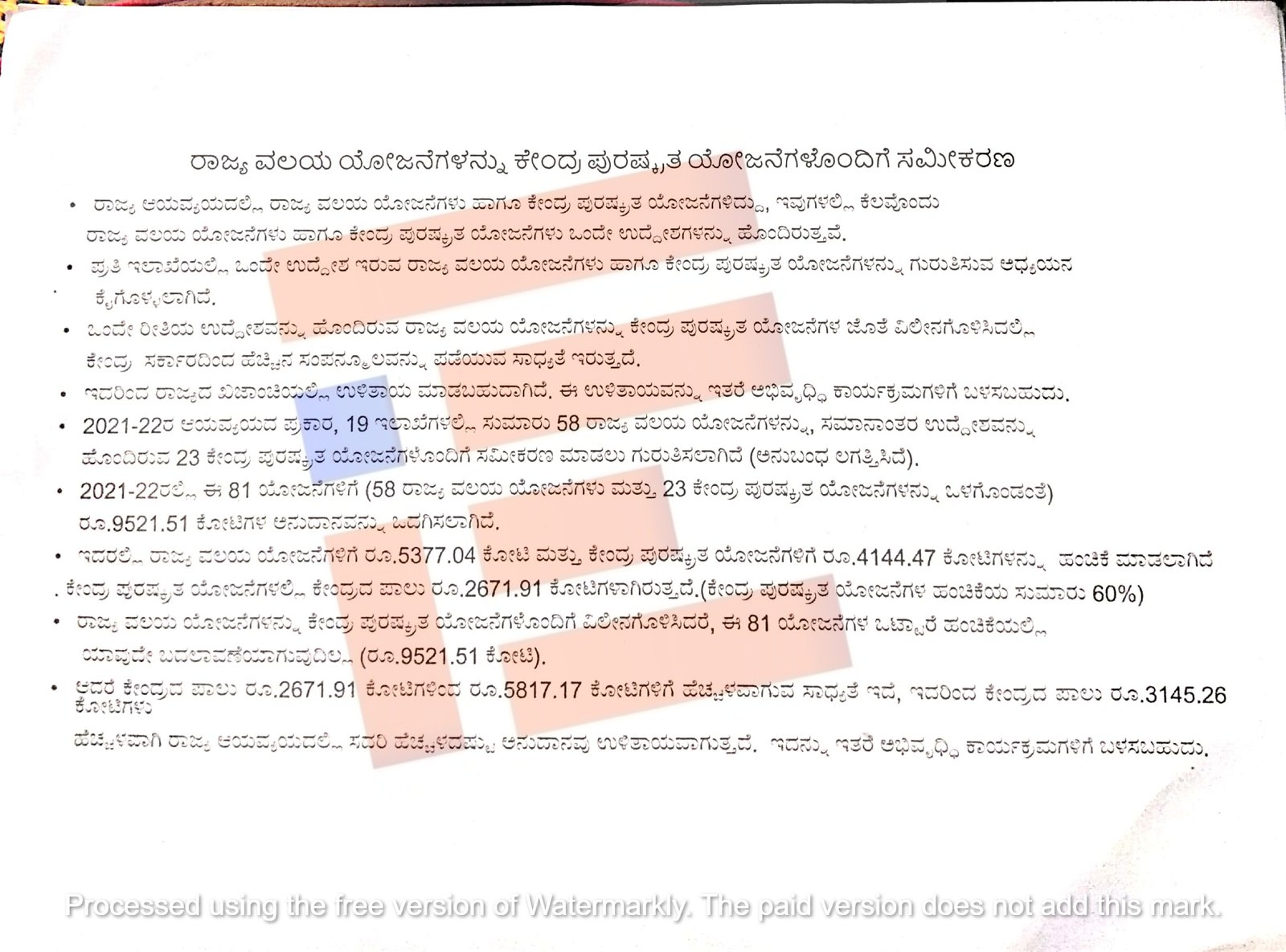 ಕೇಂದ್ರ ಪುರಸ್ಕೃತ ಯೋಜನೆಗಳಲ್ಲಿ ಕೇಂದ್ರದ ಪಾಲು 2,671.91 ಕೋಟಿ ರು.ಗಳಾಗಿದ್ದೆ (ಹಂಚಿಕೆಯ ಸುಮಾರು ಶೇ.60) ರಾಜ್ಯ ವಲಯದ ಯೋಜನೆಗಳನ್ನು ಕೇಂದ್ರ ಪುರಸ್ಕೃತ ಯೋಜನೆಗಳೊಂದಿಗೆ ವಿಲೀನಗೊಳಿಸಿದರೆ 81 ಯೋಜನೆಗಳ ಒಟ್ಟಾರೆ ಹಂಚಿಕೆಯಲ್ಲಿ (9,521.51 ಕೋಟಿ) ಯಾವುದೇ ಬದಲಾವಣೆಯಾಗುವುದಿಲ್ಲ ಎಂದು ಇಲಾಖೆಗಳು ಪ್ರತಿಪಾದಿಸಿತ್ತು.