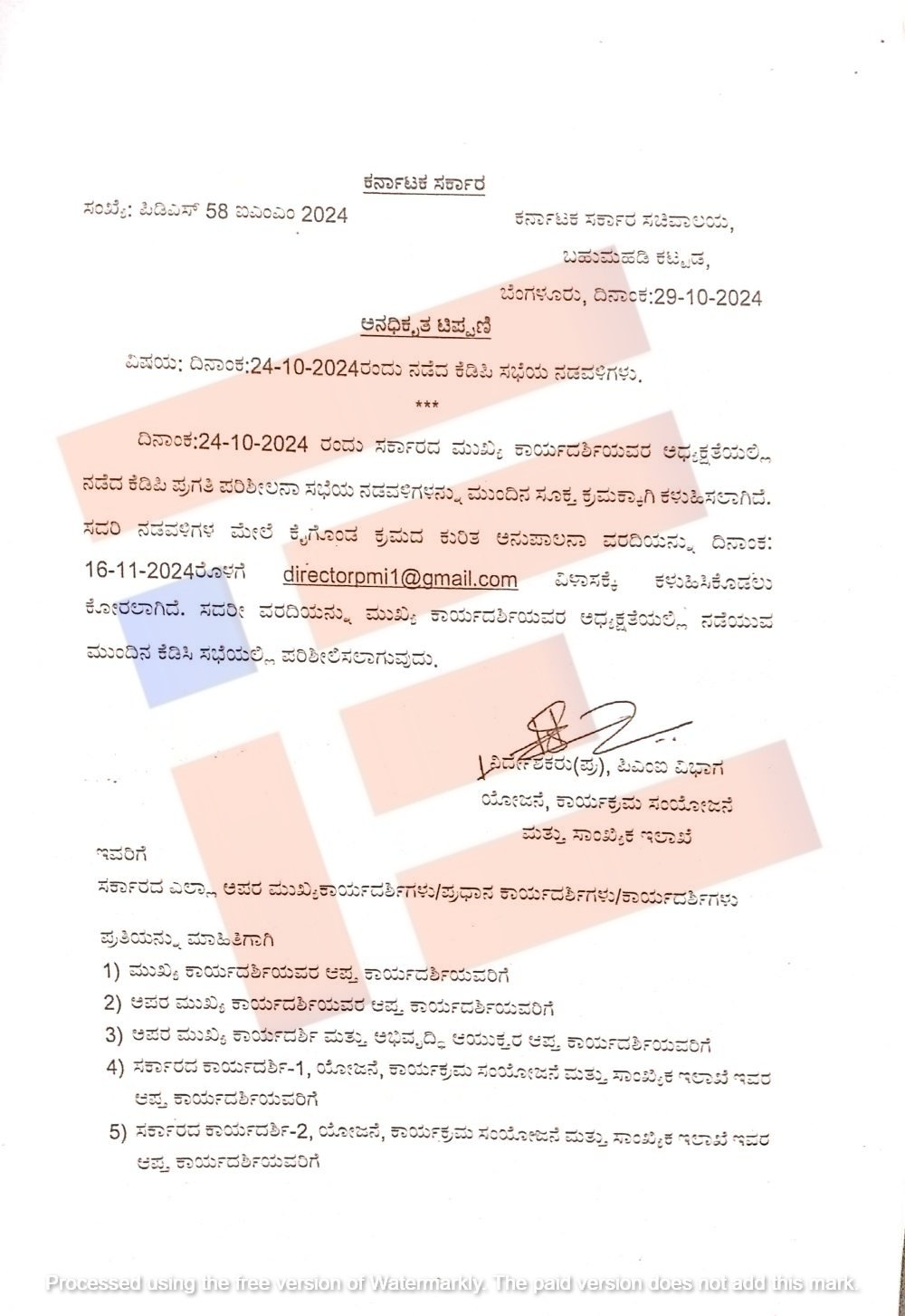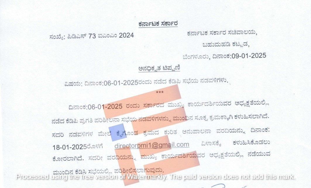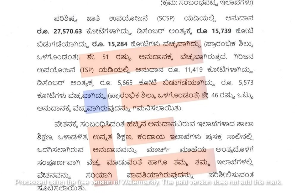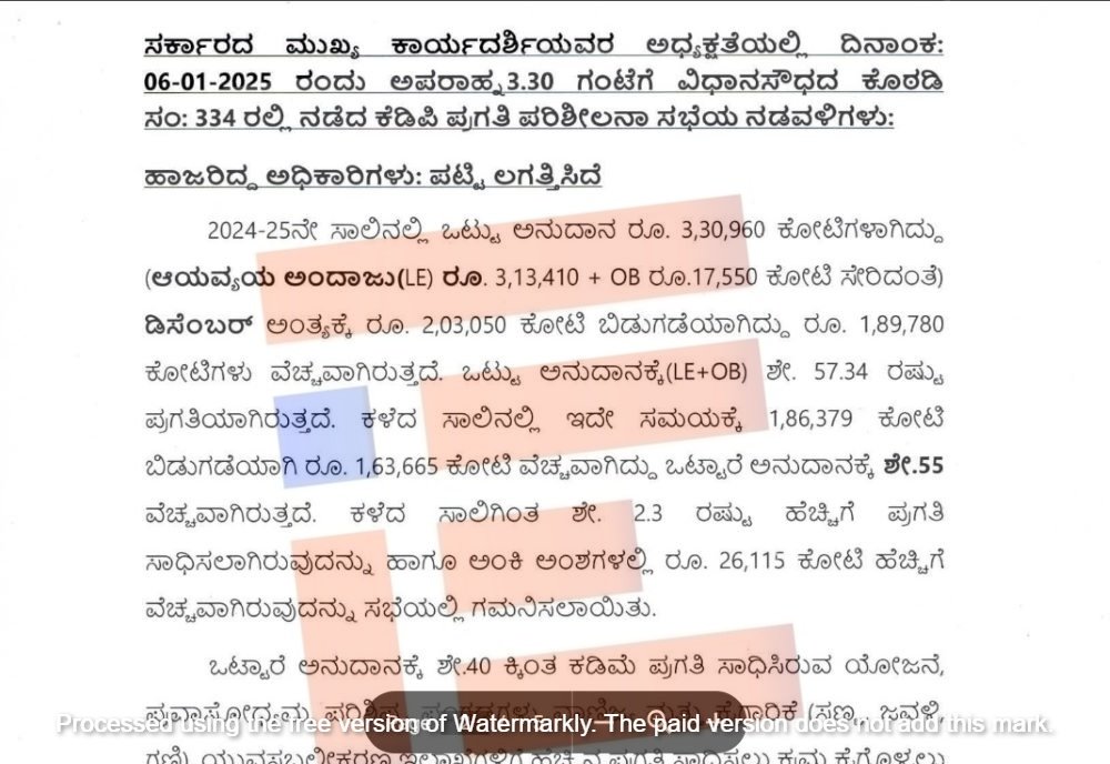 ಸರ್ಕಾರದ ಮುಖ್ಯ ಕಾರ್ಯದರ್ಶಿ ಡಾ ಶಾಲಿನಿ ರಜನೀಶ್ ಅವರ ಅಧ್ಯಕ್ಷತೆಯಲ್ಲಿ 2025ರ ಜನವರಿ 6ರಂದು ನಡೆದಿದ್ದ ಕೆಡಿಪಿ ಸಭೆಯಲ್ಲಿ ಖರ್ಚು ವೆಚ್ಚದ ಲೆಕ್ಕಾಚಾರದ ಕುರಿತು ಚರ್ಚೆಯಾಗಿದೆ.