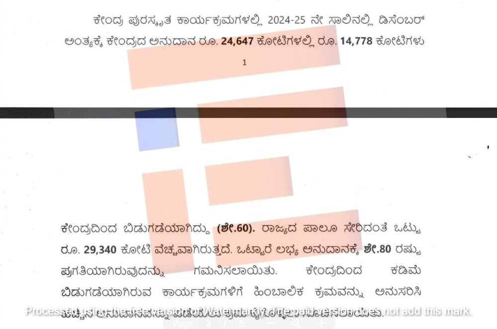 ಕೇಂದ್ರ ಪುರಸ್ಕೃತ ಕಾರ್ಯಕ್ರಮಗಳಿಗೆ ಸಂಬಂಧಿಸಿದಂತೆ 2024-25ನೇ ಸಾಲಿನಲ್ಲಿ ಡಿಸೆಂಬರ್ ಅಂತ್ಯಕ್ಕೆ ಕೇಂದ್ರವು ತನ್ನ ಪಾಲಿನ 24,647 ಕೋಟಿ ರು.ಗಳ ಪೈಕಿ 14,778 ಕೋಟಿ ರು.ಗಳನ್ನು ಬಿಡುಗಡೆ ಮಾಡಿದೆ. ಇದು ಒಟ್ಟು ಅನುದಾನಕ್ಕೆ ಹೋಲಿಸಿದರೆ ಶೇ.60ರಷ್ಟಿದೆ. ರಾಜ್ಯದ ಪಾಲೂ ಸೇರಿದಂತೆ ಒಟ್ಟಾರೆ 29,340 ಕೋಟಿ ರು. ವೆಚ್ಚವಾಗಿದೆ. ಒಟ್ಟಾರೆ ಲಭ್ಯ ಅನುದಾನಕ್ಕೆ ಶೇ.80ರಷ್ಟು ಪ್ರಗತಿ ಸಾಧಿಸಿರುವುದು ಗೊತ್ತಾಗಿದೆ.