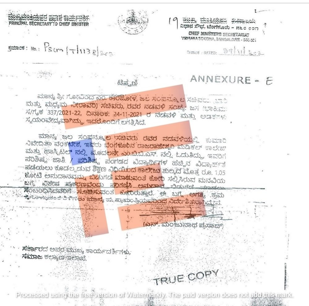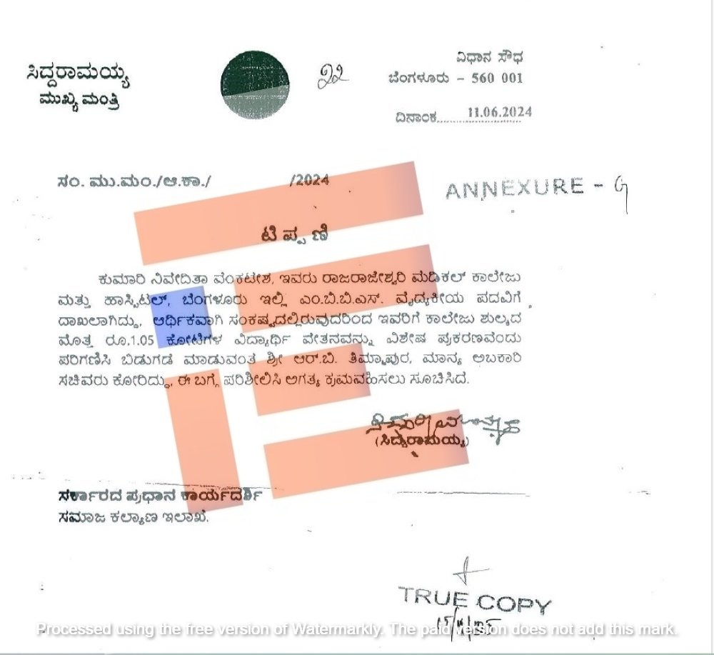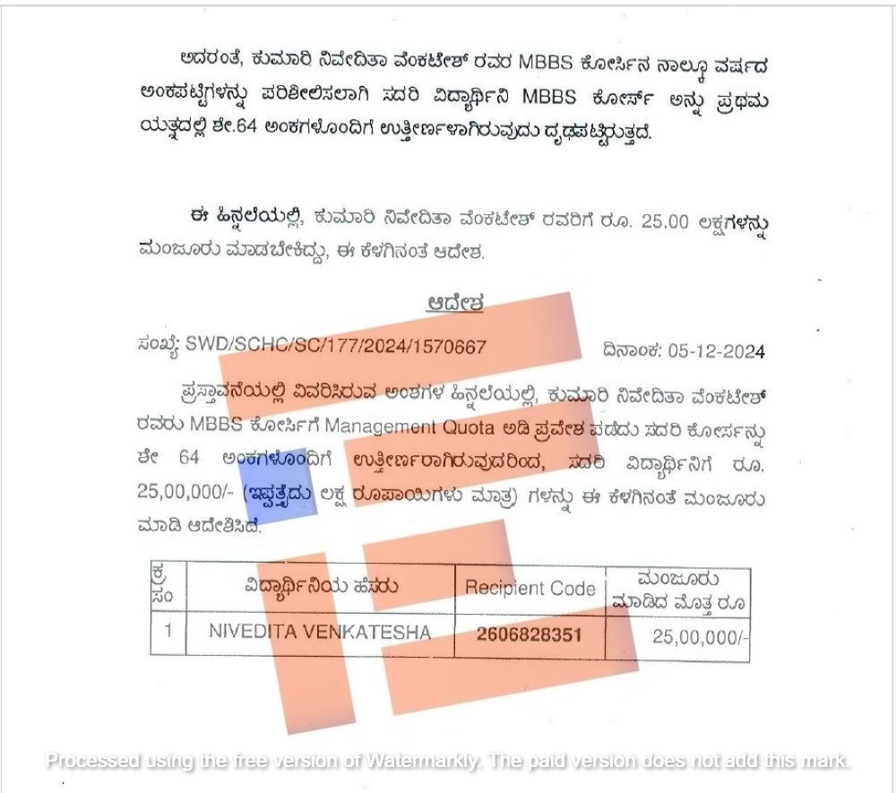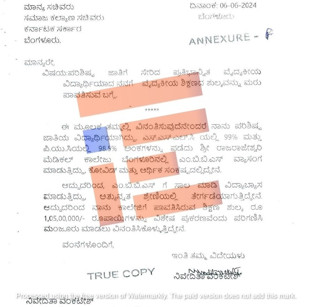 ‘ಎಂಬಿಬಿಎಸ್ಗೆ ಸಾಲ ಮಾಡಿ ವಿದ್ಯಾಭ್ಯಾಸ ಮಾಡುತ್ತಿದ್ದು ಅತ್ಯುನ್ನತ ಶ್ರೇಣಿಯಲ್ಲಿ ತೇರ್ಗಡೆಯಾಗುತ್ತಿದ್ದೇನೆ. ಆದ್ದರಿಂದ ನಾನು ಕಾಲೇಜಿಗೆ ಪಾವತಿಸಿರುವ ಶಿಕ್ಷಣ ಶುಲ್ಕ 1,05,00,000 ರು.ಗಳನ್ನು ವಿಶೇಷ ಪ್ರಕರಣವೆಂದು ಪರಿಗಣಿಸಿ ಮಂಜೂರು ಮಾಡಬೇಕು,’ ಎಂದು ನಿವೇದಿತಾ ವೆಂಕಟೇಶ್ ಅವರು 2024ರ ಜೂನ್ 6ರಂದು ಸಮಾಜ ಕಲ್ಯಾಣ ಇಲಾಖೆ ಸಚಿವ ಡಾ ಹೆಚ್ ಸಿ ಮಹದೇವಪ್ಪ ಅವರಿಗೆ ಮನವಿ ಸಲ್ಲಿಸಿದ್ದರು.