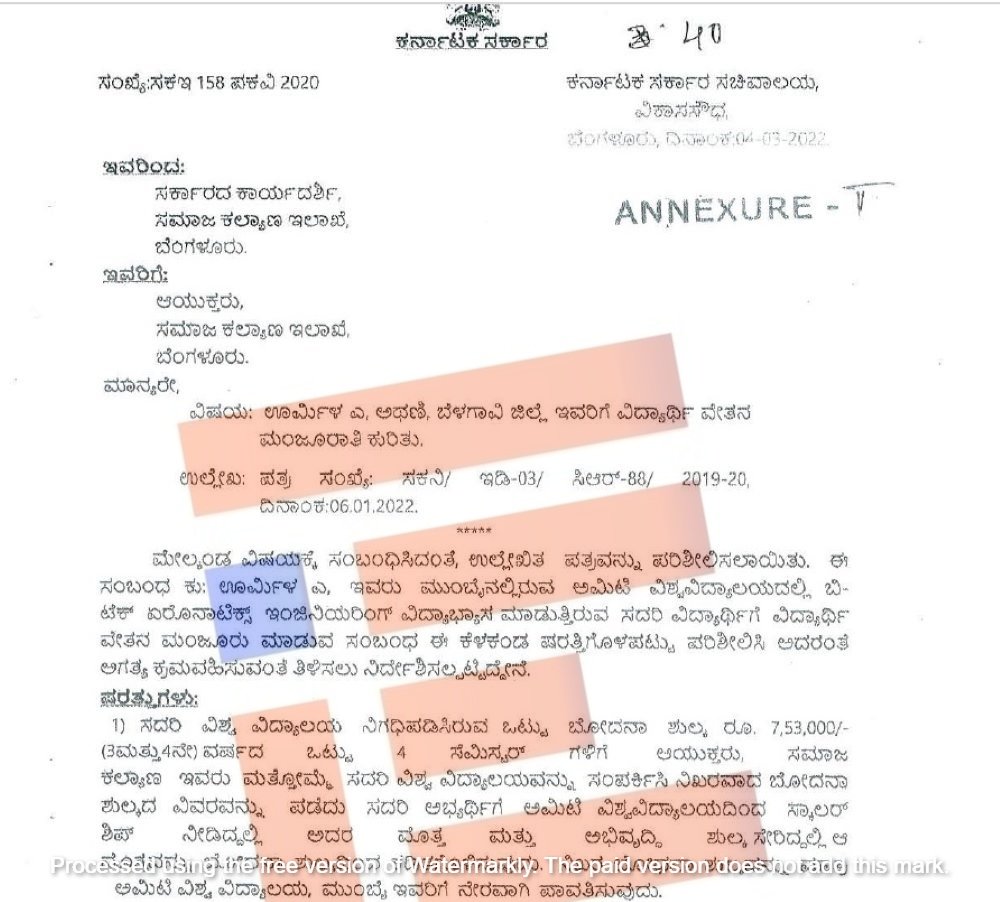 ಅದೇ ರೀತಿ ಮುಂಬೈನಲ್ಲಿರುವ ಆಮಿಟಿ ವಿಶ್ವವಿದ್ಯಾಲಯದಲ್ಲಿ ವ್ಯಾಸಂಗಮಾಡುತ್ತಿರುವ ಊರ್ಮಿಳ ಎ ಎಂಬ ವಿದ್ಯಾರ್ಥಿನಿಗೆ 2022ರ ಮಾರ್ಚ್ 4ರಂದು 7.53 ಲಕ್ಷ ರು.ಗಳನ್ನು ಮಂಜೂರು ಮಾಡಿ ಆದೇಶ ಹೊರಡಿಸಿತ್ತು.