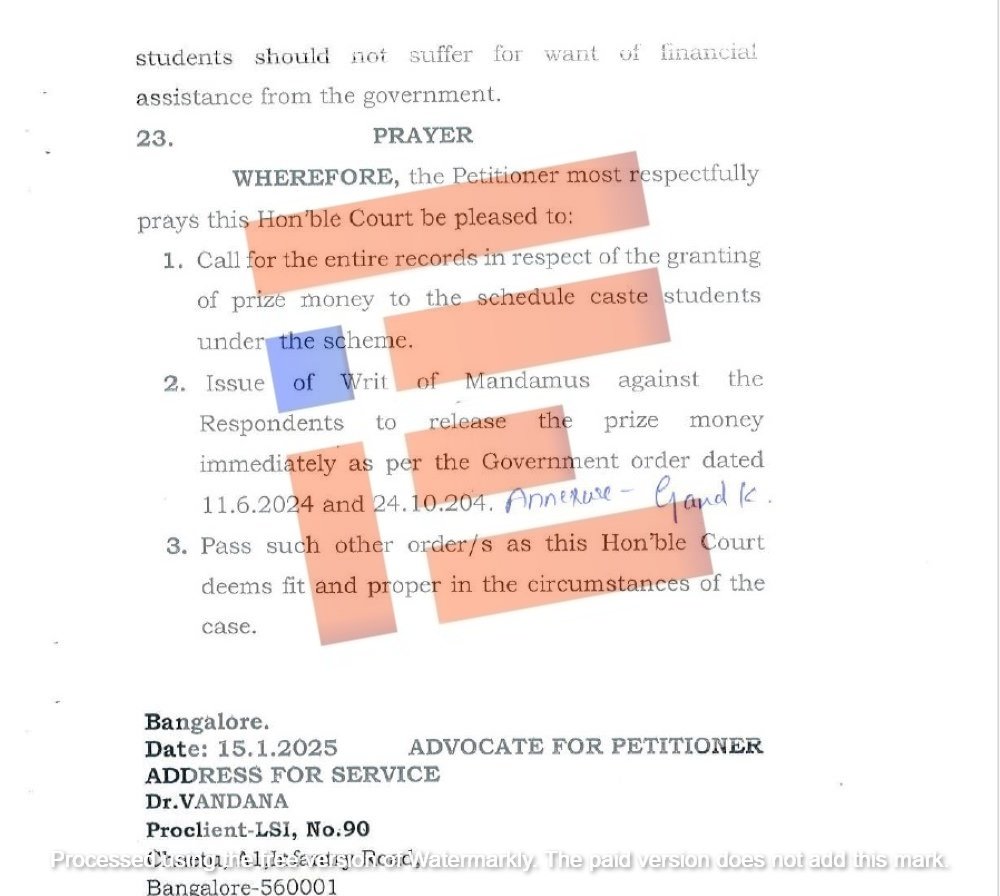 ಪರಿಶಿಷ್ಟ ಜಾತಿಯ ವಿದ್ಯಾರ್ಥಿಗಳಿಗೆ ಮಂಜೂರು ಮಾಡಿರುವ ಪ್ರೋತ್ಸಾಹ ಧನ ಮಂಜೂರು ಮಾಡಿರುವುದಕ್ಕೆ ಸಂಬಂಧಿಸಿದ ಸಂಪೂರ್ಣ ದಾಖಲೆಗಳನ್ನು ಪಡೆಯಬೇಕು ಮತ್ತು 2024ರ ಜೂನ್ ಮತ್ತು ಅಕ್ಟೋಬರ್ 24ರಂದು ಹೊರಡಿಸಿರುವ ಸರ್ಕಾರದ ಆದೇಶದ ಪ್ರಕಾರ ಪ್ರೋತ್ಸಾಹ ಧನವನ್ನು ಬಿಡುಗಡೆ ಮಾಡಬೇಕು ಎಂದು ಅರ್ಜಿಯಲ್ಲಿ ಕೋರಿರುವುದು ತಿಳಿದು ಬಂದಿದೆ.