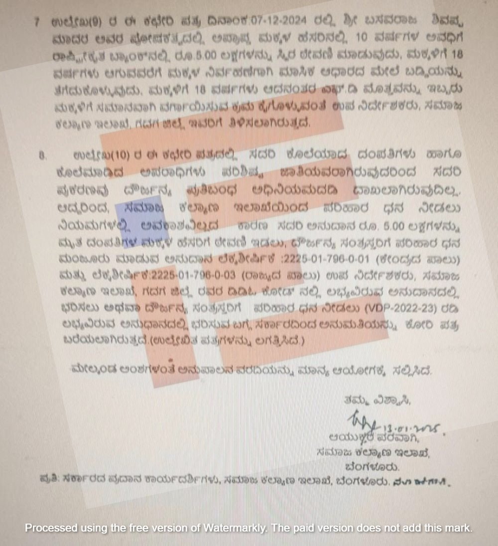 ‘ಕೊಲೆಯಾದ ದಂಪತಿಗಳು ಹಾಗೂ ಕೊಲೆ ಮಾಡಿದ ಅಪರಾಧಿಗಳು ಪರಿಶಿಷ್ಟ ಜಾತಿಯವರಾಗಿರುವುದರಿಂದ ಈ ಪ್ರಕರಣವು ದೌರ್ಜನ್ಯ ಪ್ರತಿಬಂಧ ಅಧಿನಿಯಮದಡಿ ದಾಖಲಾಗಿರುವುದಿಲ್ಲ. ಆದ್ದರಿಂದ ಸಮಾಜ ಕಲ್ಯಾಣ ಇಲಾಖೆಯಿಂದ ಪರಿಹಾರ ಧನ ನೀಡಲು ನಿಯಮಗಳಲ್ಲಿ ಅವಕಾಶವಿಲ್ಲದ ಕಾರಣ ಸದರಿ ಅನುದಾನ 5.00 ಲಕ್ಷ ರು.ಗಳನ್ನು ಮೃತ ದಂಪತಿಗಳ ಮಕ್ಕಳ ಹೆಸರಿಗೆ ಠೇವಣಿ ಇಡಲಾಗುವುದು. ದೌರ್ಜನ್ಯ ಸಂತ್ರಸ್ತರಿಗೆ ಪರಿಹಾರ ಧನ ಮಂಜೂರು ಮಾಡುವ ಅನುದಾನದ ಲೆಕ್ಕ ಶೀರ್ಷಿಕೆಯಡಿಯಲ್ಲಿ ದೌರ್ಜನ್ಯ ಸಂತ್ರಸ್ತರಿಗೆ ಪರಿಹಾರ ಧನ ನೀಡಲು ಅನುಮತಿ ನೀಡಬೇಕು,’ ಎಂದು ಆಯುಕ್ತರು ಸರ್ಕಾರವನ್ನು ಕೋರಿದ್ದರು.