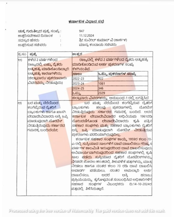 ರಾಜ್ಯಸಭೆಗೆ ಕರ್ನಾಟಕ ಕೃಷಿ ಇಲಾಖೆ ನೀಡಿರುವ ಉತ್ತರದ ಪ್ರತಿ