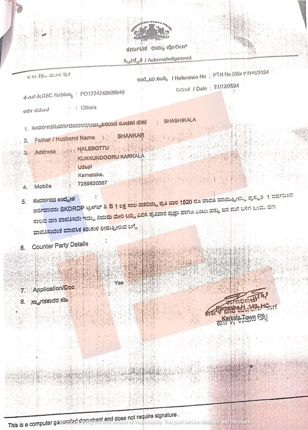 ಶಶಿಕಲಾ ಅವರು 2024ರ ಡಿಸೆಂಬರ್ 27ರಂಂದೇ ಈ ಬಗ್ಗೆ ಕಾರ್ಕಳ ಟೌನ್ ಪೊಲೀಸ್ ಠಾಣೆಗೆ ದೂರು ಸಲ್ಲಿಸಿದ್ದರು. ‘ಎಸ್ಕೆಡಿಆರ್ಡಿಪಿ ಟ್ರಸ್ಟ್ನಿಂದ 1 ಲಕ್ಷ ಸಾಲ ಪಡೆದಿದ್ದು, ಪ್ರತಿ ವಾರ 1,520 ರು. ಪಾವತಿ ಮಾಡುತ್ತಿದ್ದು ಪ್ರಸ್ತುತ 1 ವರ್ಷದಿಂದ ಸಾಲದ ಹಣ ಪಾವತಿಸದೇ ಇದ್ದು ನಿಯಮ ಮೀರಿ ಬಡ್ಡಿ ವಿಧಿಸಿ ಪ್ರತಿವಾರ ಪ್ರಜ್ಞಾ ಹಾಗೂ ಎಂಟು ಹತ್ತು ಜನ ಮನೆ ಬಳಿಗೆ ಬಂದು ಹಣ ಪಾವತಿಸುವಂತೆ ಮಾನಸಿಕ ಕಿರುಕುಳ ನೀಡುತ್ತಿದ್ದಾರೆ,’ ಎಂದು ದೂರಿನಲ್ಲಿ ಉಲ್ಲೇಖಿಸಿರುವುದು ತಿಳಿದು ಬಂದಿದೆ.