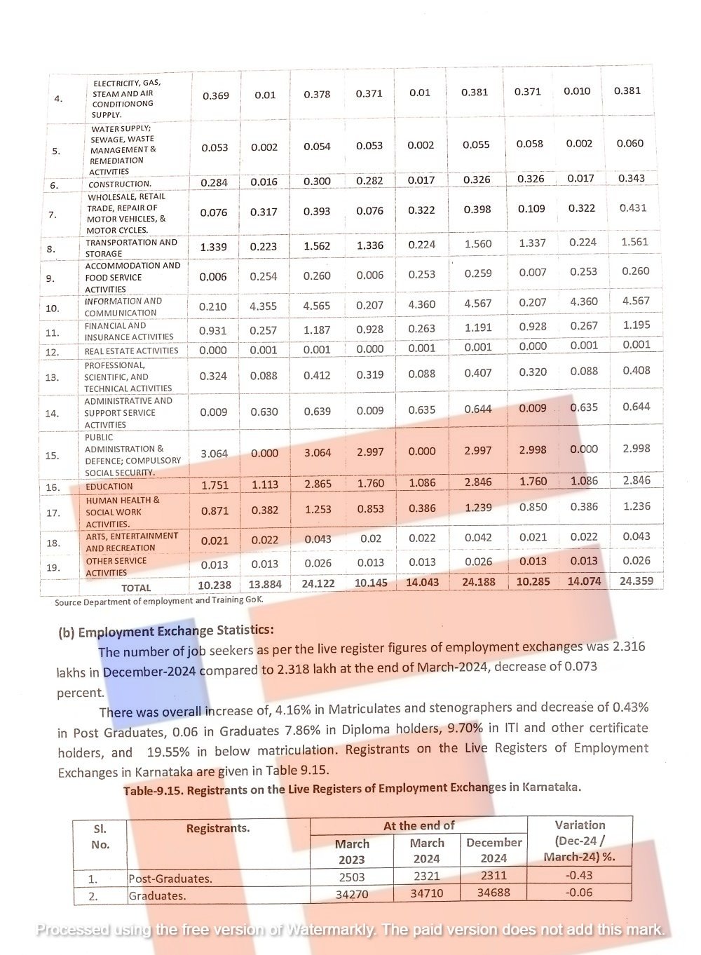 ಮಾರ್ಚ್ 2024ರ ಅಂತ್ಯಕ್ಕೆ 2.318 ಲಕ್ಷ ಮಂದಿ ಉದ್ಯೋಗ ಬಯಸಿ ನೋಂದಣಿ ಮಾಡಿಕೊಂಡಿದ್ದರೇ ಡಿಸೆಂಬರ್ 2024ರ ಅಂತ್ಯಕ್ಕೆ 2.316 ಲಕ್ಷ ಮಂದಿ ನೋಂದಣಿ ಮಾಡಿಸಿದ್ದರು. ಇದರಲ್ಲಿ 0.073ರಷ್ಟು ಇಳಿಕೆಯಾಗಿತ್ತು.