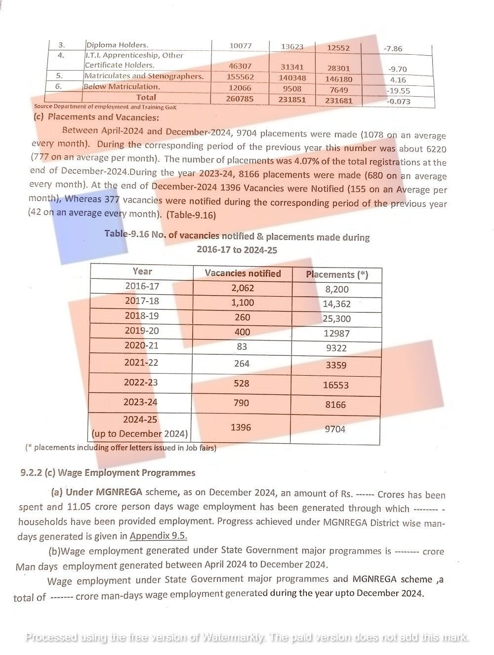 2024ರ ಏಪ್ರಿಲ್ ಮತ್ತು ಡಿಸೆಂಬರ್ ಮಧ್ಯೆ ಪ್ರತಿ ತಿಂಗಳು ಸರಾಸರಿ 1,078ರಂತೆ 9,704 ಮಂದಿಯಷ್ಟೇ ಉದ್ಯೋಗ ಪಡೆದಿದ್ದಾರೆ. ಹಿಂದಿನ ವರ್ಷಕ್ಕೆ ಹೋಲಿಸಿದರೇ ತಿಂಗಳಿಗೆ ಸರಾಸರಿ 777ರಂತೆ 6,220 ಮಂದಿಗೆ ಉದ್ಯೋಗ ದೊರೆತಿತ್ತು. ಹಾಗೆಯೇ 2023-24ನೇ ಸಾಲಿನ 2024ರ ಡಿಸೆಂಬರ್ ಅಂತ್ಯಕ್ಕೆ 8,166ರಷ್ಟು ಮಂದಿಗೆ ಉದ್ಯೋಗ ಲಭಿಸಿತ್ತು. ಇದು ಕೂಡ ತಿಂಗಳಿಗೆ ಸರಾಸರಿ 680ರಷ್ಟಿತ್ತು ಎಂದು ವರದಿಯಿಂದ ತಿಳಿದು ಬಂದಿದೆ.