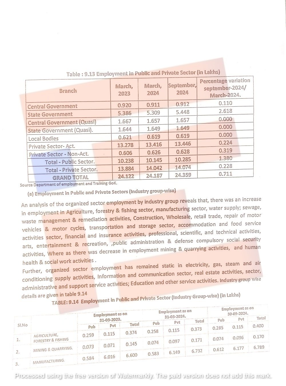 ಅದೇ ರೀತಿ ಸಾರ್ವಜನಿಕ ಮತ್ತು ಖಾಸಗಿ ವಲಯದಲ್ಲಿ ಉದ್ಯೋಗ ಸೃಷ್ಟಿಯು 2024ರ ಮಾರ್ಚ್ 2024ರ ಅಂತ್ಯಕ್ಕೆ ಶೇ.0.711ರಿಂದ 24.187 ಲಕ್ಷಕ್ಕೆ ಏರಿಕೆಯಾಗಿದೆ. ಸೆಪ್ಟಂಬರ್ ಅಂತ್ಯದವರೆಗೆ ಈ ಪ್ರಮಾಣವು 24.359 ಲಕ್ಷದಷ್ಟಿದೆ. ಸಾರ್ವಜನಿಕ ವಲಯದಲ್ಲಿ 10.285 ಲಕ್ಷ, (ಶೇ. 42.22), ಖಾಸಗಿ ವಲಯದಲ್ಲಿ 14,074 ಲಕ್ಷ (ಶೇ.57.78) ರಷ್ಟಿದೆ. ಸಾರ್ವಜನಿಕ ವಲಯದಲ್ಲಿ ಶೇ.1.380ರಷ್ಟು ಮತ್ತು ಖಾಸಗಿ ವಲಯದಲ್ಲಿ ಶೇ.0.228ರಷ್ಟು ಏರಿಕೆಯಾಗಿದೆ ಎಂದು ವರದಿಯಲ್ಲಿ ಉಲ್ಲೇಖಿಸಿದೆ.