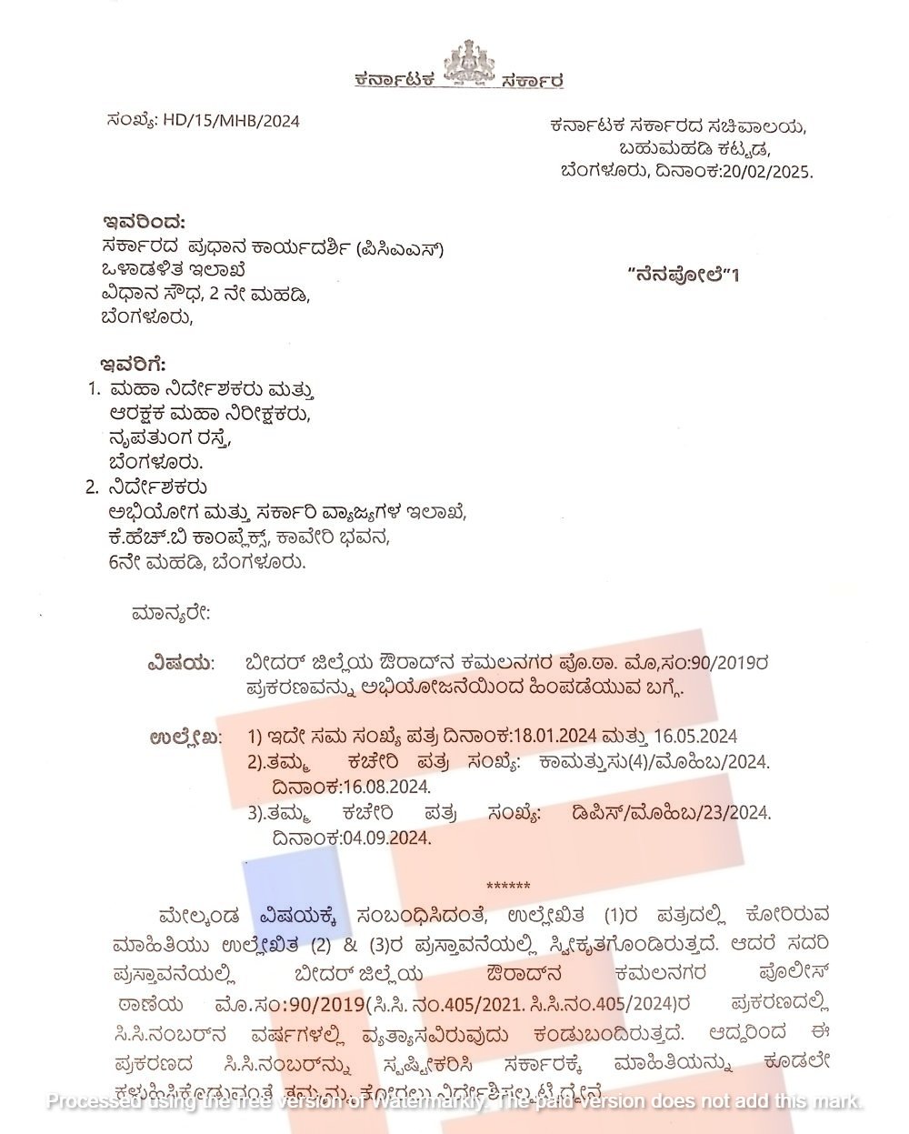 ಬೀದರ್ ಜಿಲ್ಲೆಯ ಕಮಲನಗರ ಪೊಲೀಸ್ ಠಾಣೆಯಲ್ಲಿ ದಾಖಲಾಗಿರುವ ಈ ಪ್ರಕರಣವನ್ನು ವಿಚಾರಣೆಯಿಂದ ಹಿಂಪಡೆದುಕೊಳ್ಳಲು 2024ರ ಜನವರಿ 18, ಮೇ 16, ಆಗಸ್ಟ್ 16, ಸೆ.4ರಂದು ಪತ್ರ ವ್ಯವಹಾರ ನಡೆದಿದೆ. ಅಲ್ಲದೇ 2025ರ ಫೆ.20ರಂದು ಮೊದಲನೇ ನೆನಪೋಲೆಯನ್ನೂ ಸಹ ಪೊಲೀಸ್ ಮಹಾನಿರ್ದೇಶಕರಿಗೆ ಬರೆದಿರುವುದು ಗೊತ್ತಾಗಿದೆ.
