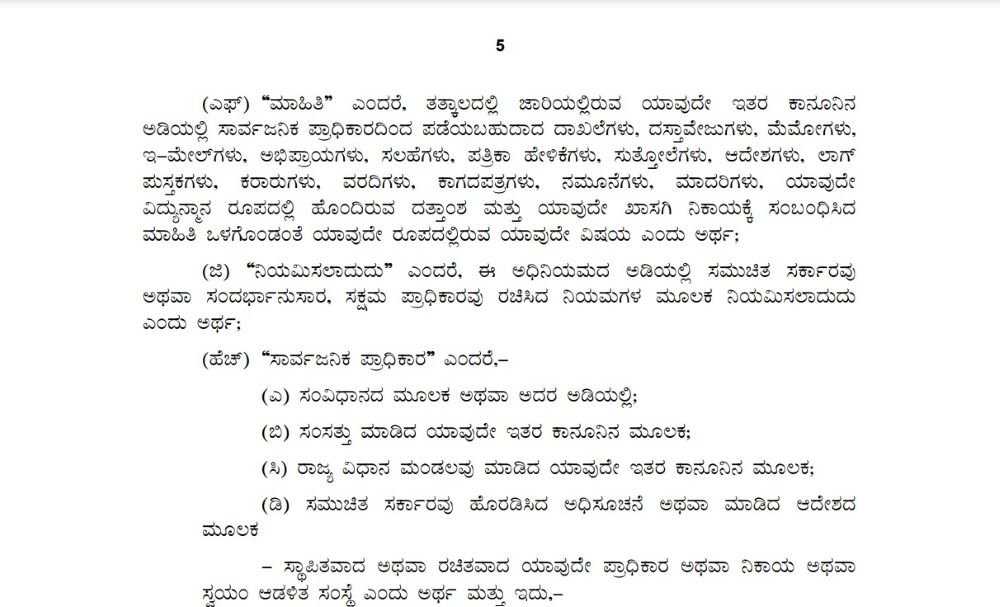 ಮಾಹಿತಿ ಎಂದರೆ ತತ್ಕಾಲದಲ್ಲಿ ಜಾರಿಯಲ್ಲಿರುವ ಯಾವುದೇ ಇತರೆ ಕಾನೂನಿನ ಅಡಿಯಲ್ಲಿ ಸಾರ್ವಜನಿಕ ಪ್ರಾಧಿಕಾರದಿಂದ ಪಡೆಯಬಹುದಾದ ದಾಖಲೆಗಳು, ದಸ್ತಾವೇಜುಗಳು, ಮೆಮೋಗಳು, ಇ-ಮೇಲ್ಗಳು, ಅಭಿಪ್ರಾಯಗಳು, ಸಲಹೆಗಳು, ಪತ್ರಿಕಾ ಹೇಳಿಕೆಗಳು, ಸುತ್ತೋಲೆಗಳು, ಆದೇಶಗಳು, ಲಾಗ್ ಪುಸ್ತಕಗಳು, ಕರಾರುಗಳು, ವರದಿಗಳು, ಕಾಗದಪತ್ರಗಳು, ನಮೂನೆಗಳು, ಮಾದರಿಗಳು ಯಾವುದೇ ವಿದ್ಯುನ್ಮಾನ ರೂಪದಲ್ಲಿ ಹೊಂದಿರುವ ದತ್ತಾಂಶ ಮತ್ತು ಯಾವುದೇ ಖಾಸಗಿ ನಿಕಾಯಕ್ಕೆ ಸಂಬಂಧಿಸಿದ ಮಾಹಿತಿ ಒಳಗೊಂಡಂತೆ ಯಾವುದೇ ರೂಪದಲ್ಲಿರುವ ಯಾವುದೇ ವಿಷಯ ಎಂದು ಅರ್ಥ ಎಂದು ಕಾಯ್ದೆಯಲ್ಲಿ ವಿವರಿಸಿದೆ.