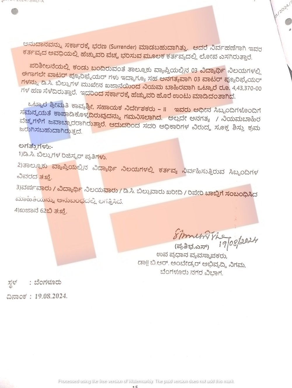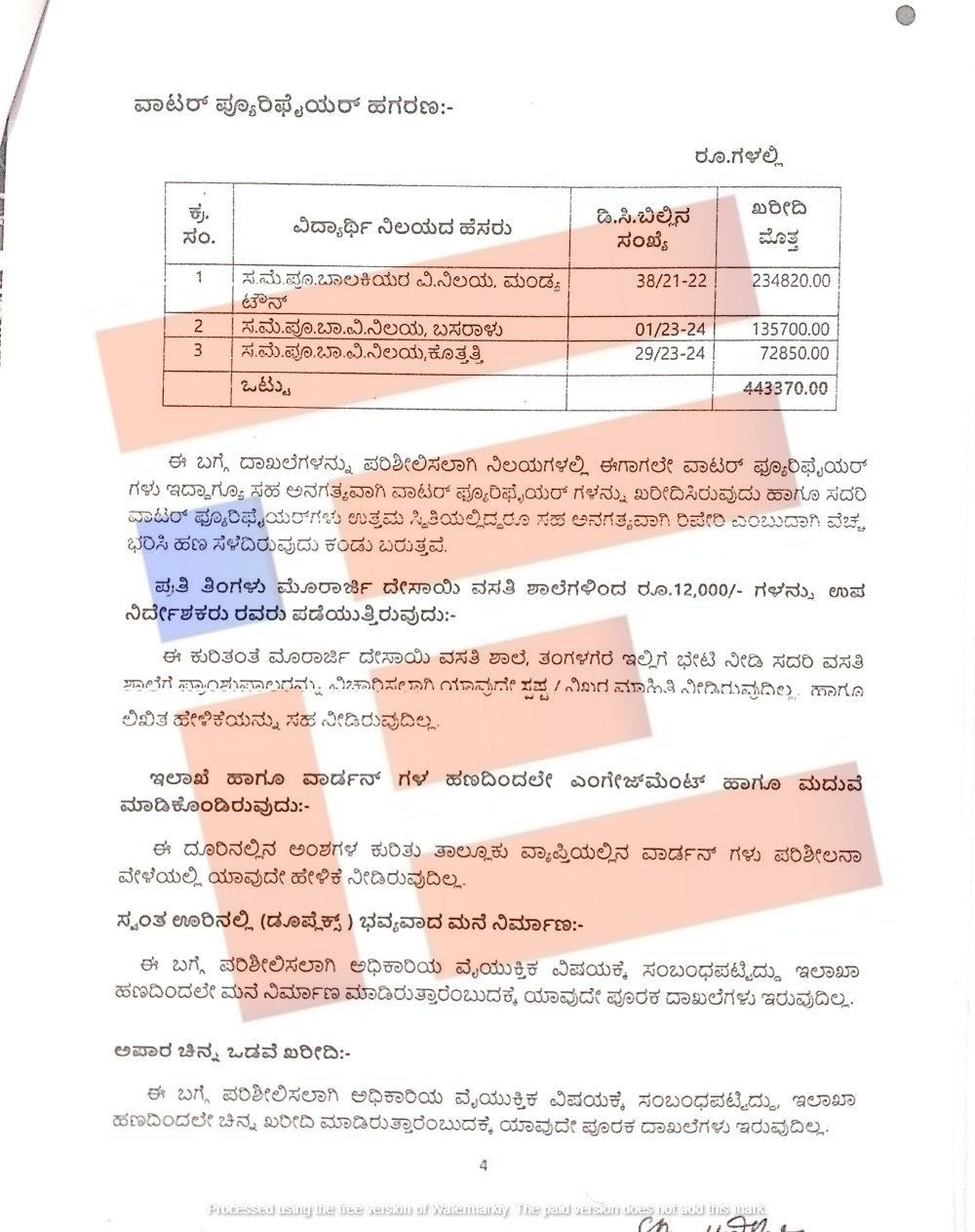 ‘ಪರಿಶೀಲನೆಯಲ್ಲಿ ಕಂಡು ಬಂದಿರುವಂತೆ ತಾಲೂಕು ವ್ಯಾಪ್ತಿಯಲ್ಲಿನ 03 ವಿದ್ಯಾರ್ಥಿ ನಿಲಯಗಳಲ್ಲಿ ಈಗಾಗಲೇ ವಾಟರ್ ಫ್ಯೂರಿಫೈಯರ್ಗಳಿ ಇದ್ದಾಗ್ಯೂ ಸಹ ಅನಗತ್ಯವಾಗಿ 3 ವಾಟರ್ ಫ್ಯೂರಿಫೈಯರ್ಗಳನ್ನು ಡಿ ಸಿ ಬಿಲ್ಗಳ ಮೂಲಕ ಖಜಾನೆಯಿಂದ ನಿಯಮಬಾಹಿರವಾಗಿ 4,43,370 ರುಗಳನ್ನು ಸೆಳೆದಿರುತ್ತಾರೆ. ಇದರಿಂದ ಸರ್ಕಾರಕ್ಕೆ ಹೆಚ್ಚುವರಿ ಹೊರೆ ಉಂಟು ಮಾಡಿದಂತಾಗಿದೆ,’ ಎಂದು ತಪಾಸಣೆ ವರದಿಯಲ್ಲಿ ವಿವರಿಸಿರುವುದು ತಿಳಿದು ಬಂದಿದೆ.
