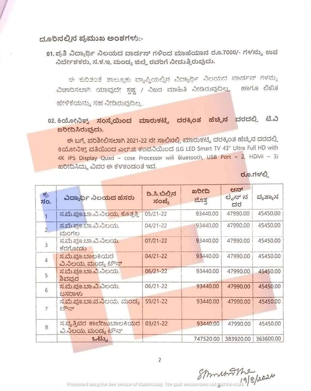 ಕೊತ್ತತ್ತಿ, ಮಂಗಲ, ಕೆರೆಗೋಡು, ಮಂಡ್ಯ ಟೌನ್, ಶಿವಪುರ, ಬಸರಾಳುವಿನಲ್ಲಿರುವ 8 ವಿದ್ಯಾರ್ಥಿ ನಿಲಯಗಳಿಗೆ ತಲಾ 93,440 ರು. ದರದಲ್ಲಿ ಒಟ್ಟು 7,47,520 ರು ವೆಚ್ಚದಲ್ಲಿ ಖರೀದಿಸಲಾಗಿತ್ತು. ಆದರೆ ಇದೇ ಟಿ ವಿ ಗೆ ಆನ್ ಲೈನ್ನಲ್ಲಿ ತಲಾ ಟಿ ವಿ ಒಂದಕ್ಕೆ 47,990 ರು. ಇತ್ತು. ಇದರ ಪ್ರಕಾರ 8 ಟಿ ವಿ ಗಳಿಗೆ 3,83,920 ರು. ಆಗಲಿದೆ. ಆದರೆ ಇಲಾಖೆಯು ಖರೀದಿಸಿದ್ದ ಟಿ ವಿ ದರಗಳಿಗೆ ಹೋಲಿಸಿದರೆ 3,63,600 ರು. ವ್ಯತ್ಯಾಸವಿತ್ತು ಎಂದು ವರದಿಯಲ್ಲಿ ದಾಖಲೆ ಸಮೇತ ವಿವರಿಸಿದೆ.