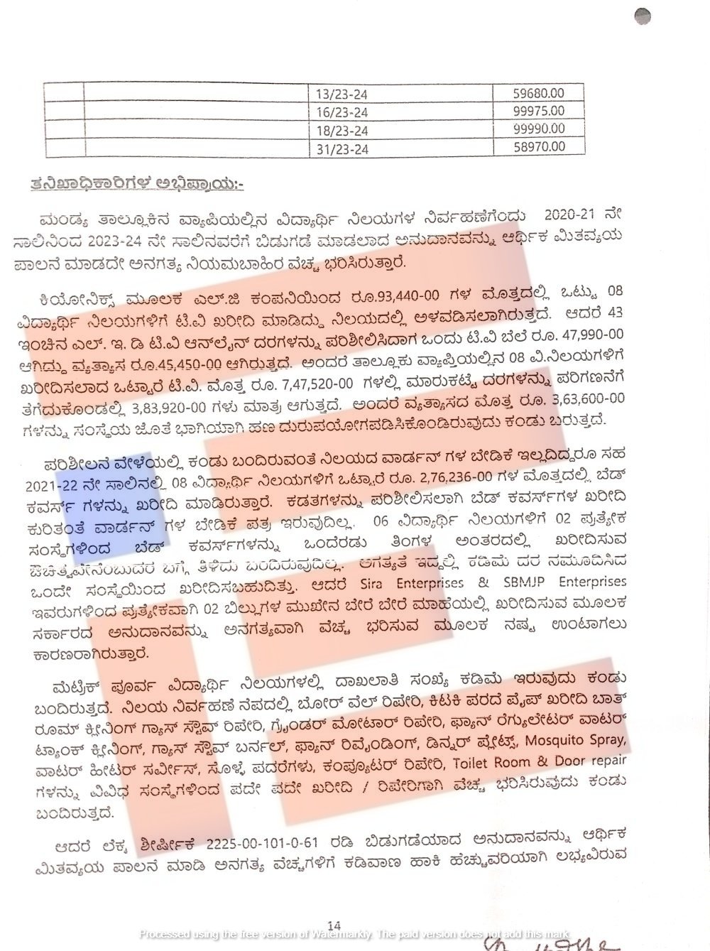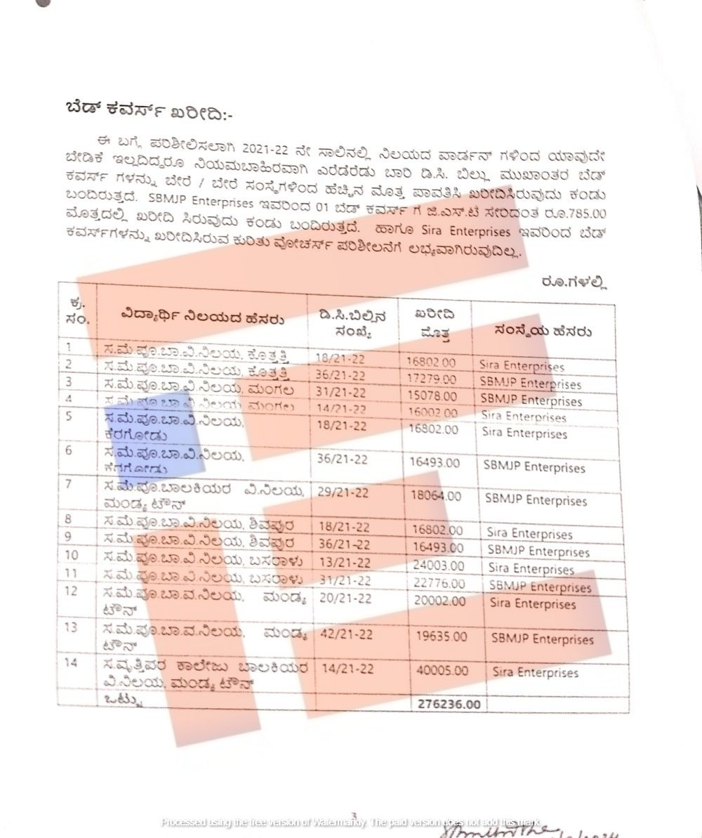 ಆದರೆ ಬೆಡ್ ಕವರ್ಸ್ಗಳಿಗೆ ವಿದ್ಯಾರ್ಥಿ ನಿಲಯಗಳ ವಾರ್ಡನ್ಗಳಿಂದ ಯಾವುದೇ ಬೇಡಿಕೆ ಇರಲಿಲ್ಲ. ಆದರೂ ನಿಯಮಬಾಹಿರವಾಗಿ ಎರಡೆರಡು ಬಾರಿ ಡಿ ಸಿ ಬಿಲ್ ಮುಖಾಂತರ ಬೆಡ್ ಕವರ್ಸ್ಗಳನ್ನು ಬೇರೆ ಬೇರೆ ಸಂಸ್ಥೆಗಳಿಂದ ಹೆಚ್ಚಿನ ಮೊತ್ತ ಪಾವತಿಸಿ ಖರೀದಿಸಿತ್ತು. ಎಸ್ಬಿಎಂಜೆಪಿ ಎಂಟರ್ ಪ್ರೈಸೆಸ್ನಿಂದ 01 ಬೆಡ್ ಕವರ್ಸ್ಗೆ ಜಿ ಎಸ್ ಟಿ ಸೇರಿದಂತೆ 785.00 ಮೊತ್ತದಲ್ಲಿ ಖರೀದಿಸಿರುವುದು ಕಂಡು ಬರುತ್ತದೆ. ಆದರೆ ಸಿರಾ ಎಂಟರ್ ಪ್ರೈಸೆಸ್ನಿಂದ ಬೆಡ್ ಕವರ್ಸ್ ಖರೀದಿಸಿರುವ ಬಗ್ಗೆ ವೋಚರ್ಸ್ಗಳನ್ನು ಪರಿಶೀಲನೆ ನೀಡಿರಲಿಲ್ಲ ಎಂದು ವರದಿಯಿಂದ ಗೊತ್ತಾಗಿದೆ.
