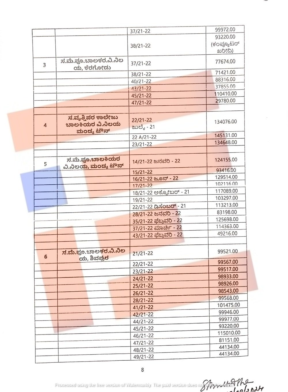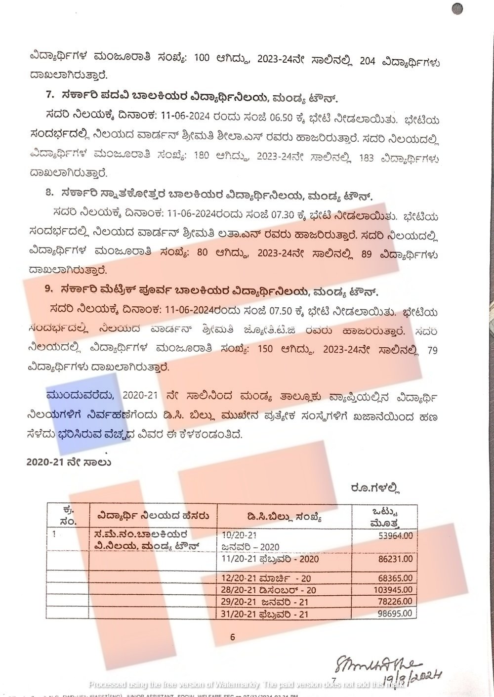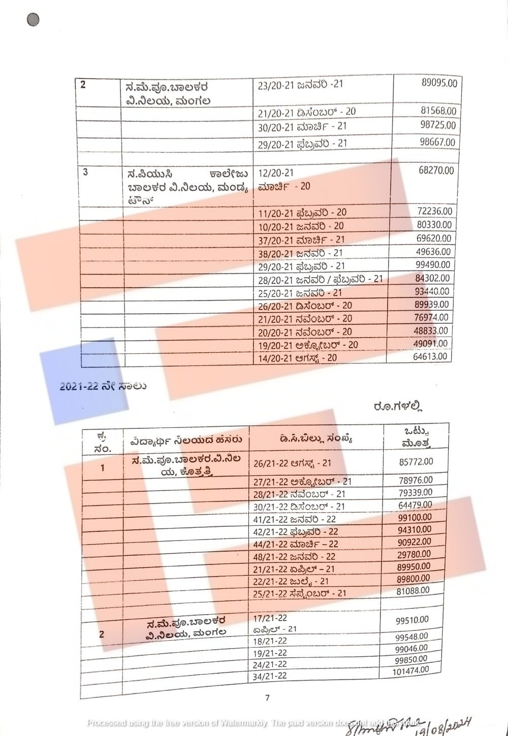 ಶಿವಪುರದಲ್ಲಿರುವ ಸರ್ಕಾರಿ ಮೆಟ್ರಿಕ್ ಪೂರ್ವ ಬಾಲಕರ ವಿದ್ಯಾರ್ಥಿ ನಿಲಯವು 14,92,704 ರು., ಬಸರಾಳುವಿನಲ್ಲಿರುವ ಸರ್ಕಾರಿ ಬಾಲಕರ ವಿದ್ಯಾರ್ಥಿ ನಿಲಯವು 12,94,596 ರು., ಮಂಡ್ಯ ಟೌನ್ನಲ್ಲಿರುವ ಸರ್ಕಾರಿ ಮೆಟ್ರಿಕ್ ಪೂರ್ವ ಬಾಲಕರ ವಿದ್ಯಾರ್ಥಿ ನಿಲಯವು 9,20,474 ರು.ಗಳನ್ನು ಡಿ ಸಿ ಬಿಲ್ ಮೂಲಕ ಹಣ ಸೆಳೆದಿತ್ತು.