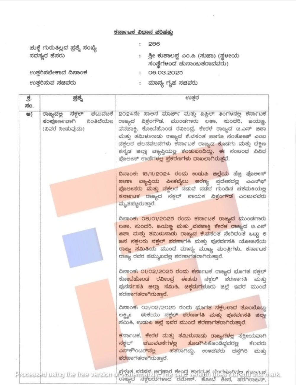 2024ನೇ ಸಾಲಿನ ಮಾರ್ಚ್ ಮತ್ತು ಏಪ್ರಿಲ್ ತಿಂಗಳಿನಲ್ಲಿ ಕರ್ನಾಟಕ ರಾಜ್ಯದ ವಿಕ್ರಂಗೌಡ, ಮುಂಡಗಾರು ಲತಾ, ಸುಂದರಿ, ಜಯಣ್ಣ, ವನಜಾಕ್ಷಿ, ಕೋಟೆಹೊಂಡ ರವೀಂದ್ರ, ಕೇರಳ ರಾಜ್ಯದ ಟಿ ಎನ್ ಜಿಶಧಾ ಮತ್ತು ತಮಿಳುನಾಡು ರಾಜ್ಯದ ಕೆ ವಸಂತ ಹಾಗೂ ಸಂತೋಷ್ ಎಂಬ ನಕ್ಸಲರ ಚಲನವಲನಗಳು ಕರ್ನಾಟಕ ರಾಜ್ಯದ ಕೊಡಗು ಮತ್ತು ದಕ್ಷಿಣ ಕನ್ನಡ ಜಿಲ್ಲಾ ವ್ಯಾಪ್ತಿಯಲ್ಲಿ ಕಂಡು ಬಂದಿವೆ. ಈ ಸಂಬಂಧ ವಿವಿಧ ಪೊಲೀಸ್ ಠಾಣೆಗಳಲ್ಲಿ ಪ್ರಕರಣಗಳು ದಾಖಲಾಗಿರುತ್ತವೆ ಎಂದು ಗೃಹ ಸಚಿವರ ಉತ್ತರದಲ್ಲಿ ವಿವರಿಸಲಾಗಿದೆ.