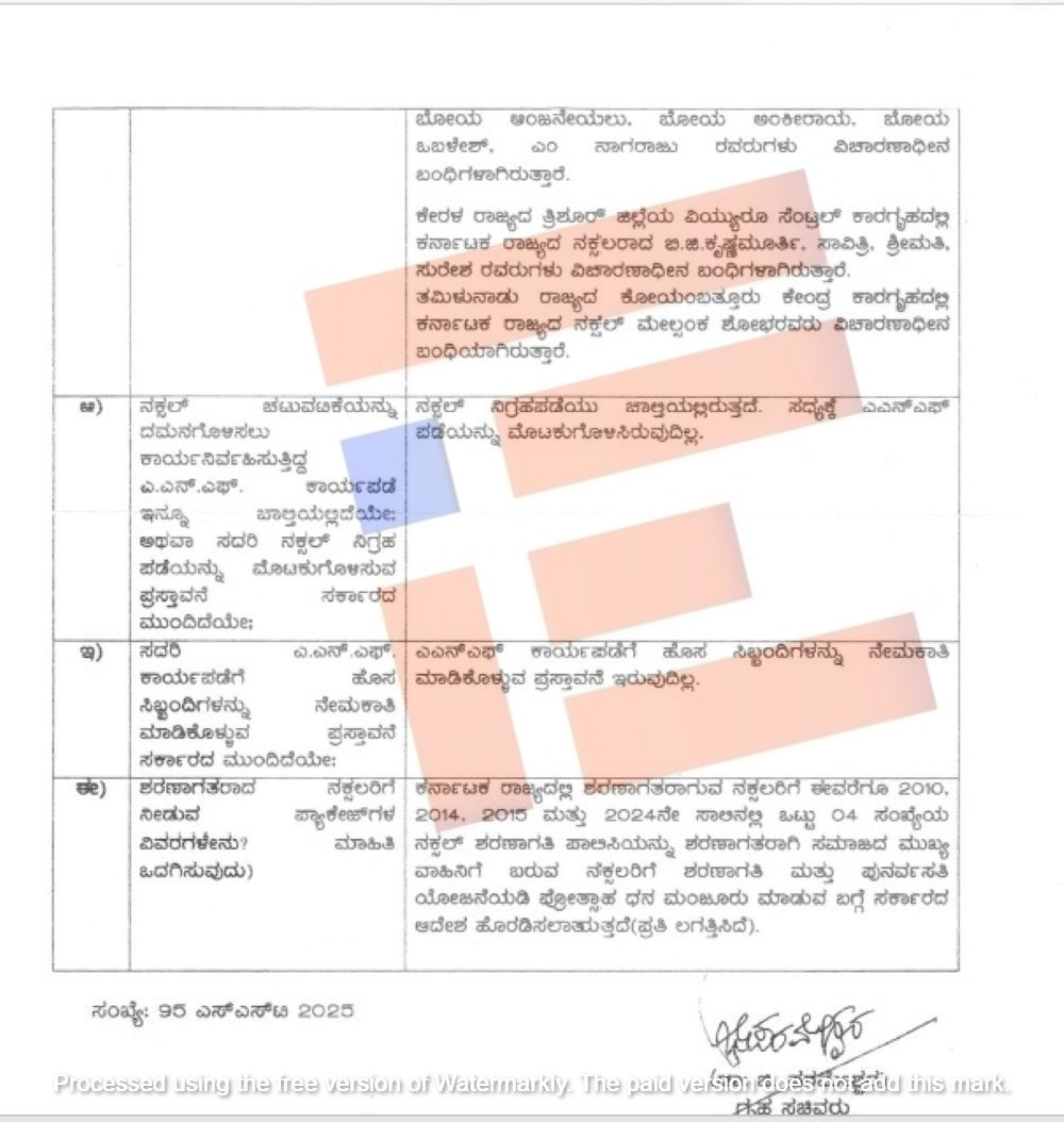 ನಕ್ಸಲ್ ನಿಗ್ರಹ ಪಡೆಯು ಚಾಲ್ತಿಯಲ್ಲಿದೆ ಮತ್ತು ಅದನ್ನು ಸದ್ಯಕ್ಕೆ ಮೊಟಕುಗೊಳಿಸುವುದಿಲ್ಲ ಎಂದು ಗೃಹ ಸಚಿವ ಡಾ ಜಿ ಪರಮೇಶ್ವರ್ ಅವರು ಸದನದಲ್ಲೇ ಲಿಖಿತ ಉತ್ತರ ನೀಡಿದ್ದರೇ, ಇತ್ತ ಮುಖ್ಯಮಂತ್ರಿ ಸಿದ್ದರಾಮಯ್ಯ ಅವರು 2025-26ನೇ ಸಾಲಿನ ಬಜೆಟ್ ಭಾಷಣದಲ್ಲಿ ನಕ್ಸಲ್ ನಿಗ್ರಹ ಪಡೆಯನ್ನು ವಿಸರ್ಜಿಸಲಾಗುವುದು ಎಂದು ಘೋಷಣೆ ಮಾಡಿದ್ದಾರೆ.