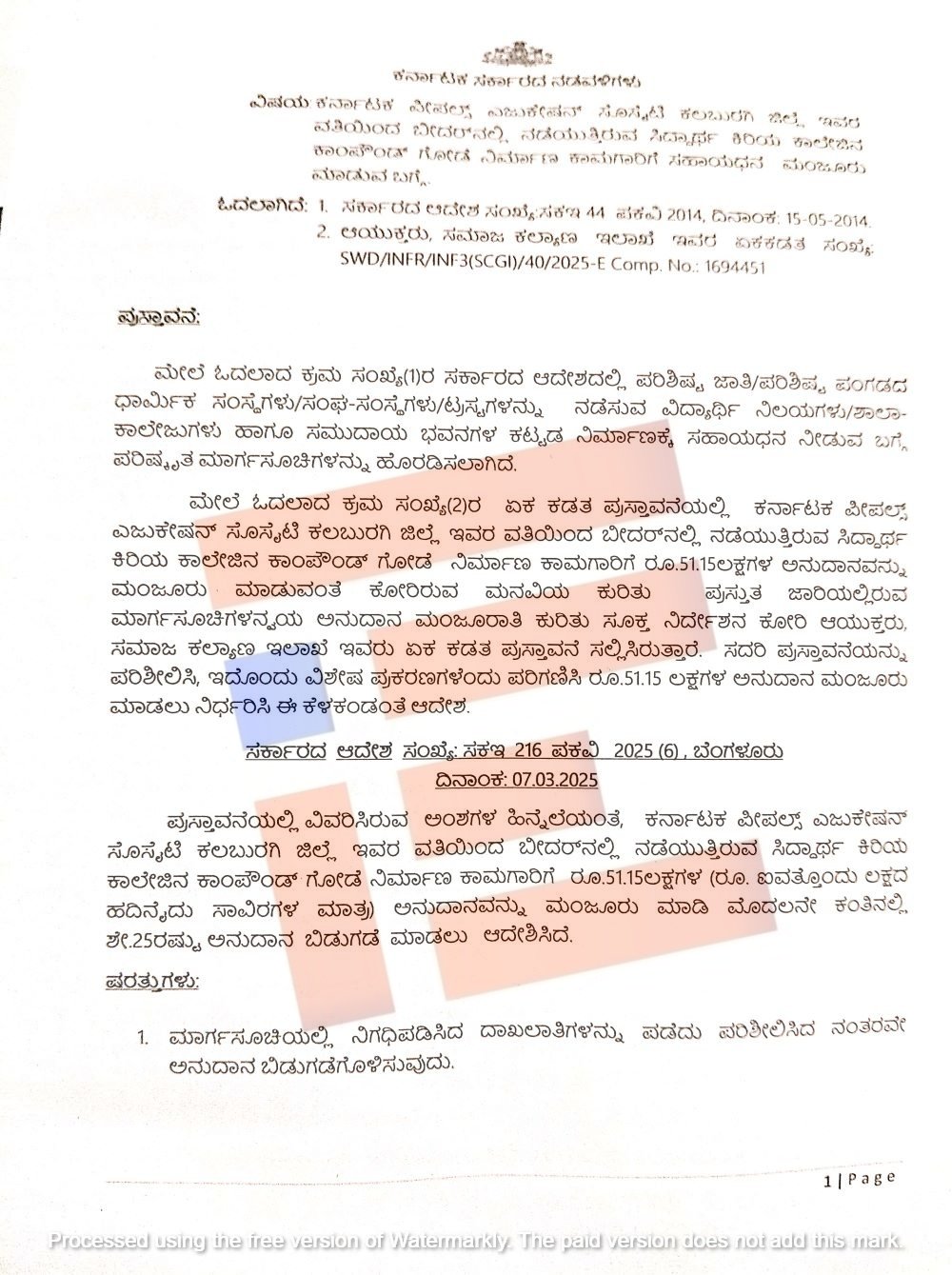 ಈ ಮಾರ್ಗಸೂಚಿಗಳ ಅನ್ವಯ ಕಲ್ಬುರ್ಗಿಯಲ್ಲಿರುವ ಕರ್ನಾಟಕ ಪೀಪಲ್ಸ್ ಎಜುಕೇಷನ್ ಸೊಸೈಟಿಯು ಸಹಾಯಧನ ನೀಡುವ ಸಂಬಂಧ ಸರ್ಕಾರಕ್ಕೆ ಕೋರಿಕೆ ಸಲ್ಲಿಸಿತ್ತು. ಈ ಸೊಸೈಟಿಯು ಬೀದರ್ನಲ್ಲಿ ನಡೆಸುತ್ತಿರುವ ಸಿದ್ಧಾರ್ಥ ಕಿರಿಯ ಕಾಲೇಜಿನ ಕಾಂಪೌಂಡ್ ಗೋಡೆ ನಿರ್ಮಾಣಕ್ಕೆ ಸಹಾಯ ಧನ ನೀಡಬೇಕು ಎಂದು ಕೋರಿತ್ತು. ಇದರ ಅನ್ವಯ ಸಮಾಜ ಕಲ್ಯಾಣ ಇಲಾಖೆಯು ಏಕ ಕಡತವನ್ನು ತೆರೆದಿತ್ತು.