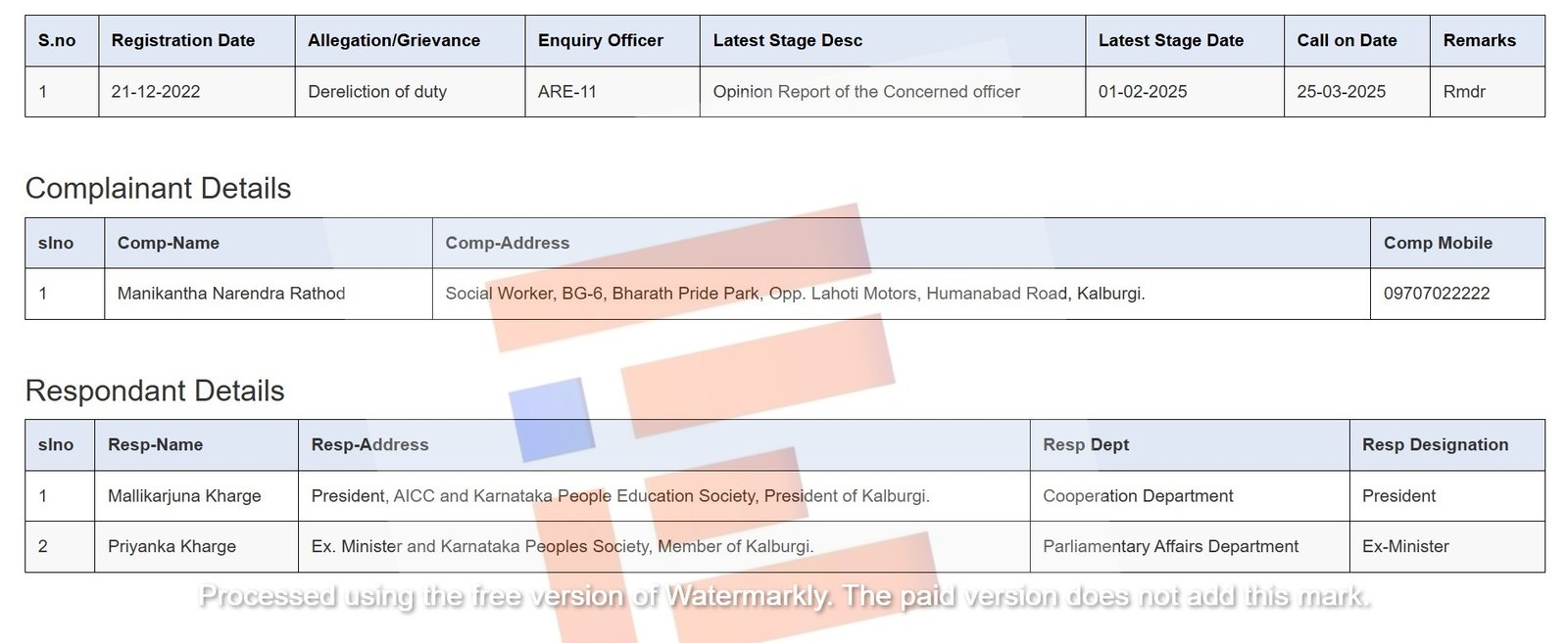 ಈ ಸೊಸೈಟಿಗೆ ಸಂಸ್ಥಾಪಕ ಅಧ್ಯಕ್ಷರಾಗಿರುವ ಎಐಸಿಸಿ ಅಧ್ಯಕ್ಷ ಮಲ್ಲಿಕಾರ್ಜುನ ಖರ್ಗೆ ಮತ್ತು ಸದಸ್ಯ ಪ್ರಿಯಾಂಕ್ ಖರ್ಗೆ ಅವರ ವಿರುದ್ಧ ಮಣಿಕಂಠ್ ಎಂಬುವರು ಲೋಕಾಯುಕ್ತದಲ್ಲಿ 2022ರಲ್ಲೇ ದೂರು ದಾಖಲಿಸಿದ್ದರು. ಈ ದೂರು ಇನ್ನೂ ಇತ್ಯರ್ಥವಾಗದೇ ಇದ್ದರೂ ಸಹ ಸಮಾಜ ಕಲ್ಯಾಣ ಇಲಾಖೆಯು 2025ರ ಮಾರ್ಚ್ 7ರಂದು 51.15 ಲಕ್ಷ ರು.ಗಳ ಅನುದಾನವನ್ನು ಮಂಜೂರು ಮಾಡಿ ಆದೇಶ ಹೊರಡಿಸಿದೆ. ಈ ಆದೇಶದ ಪ್ರತಿಯು ‘ದಿ ಫೈಲ್’ಗೆ ಲಭ್ಯವಾಗಿದೆ.