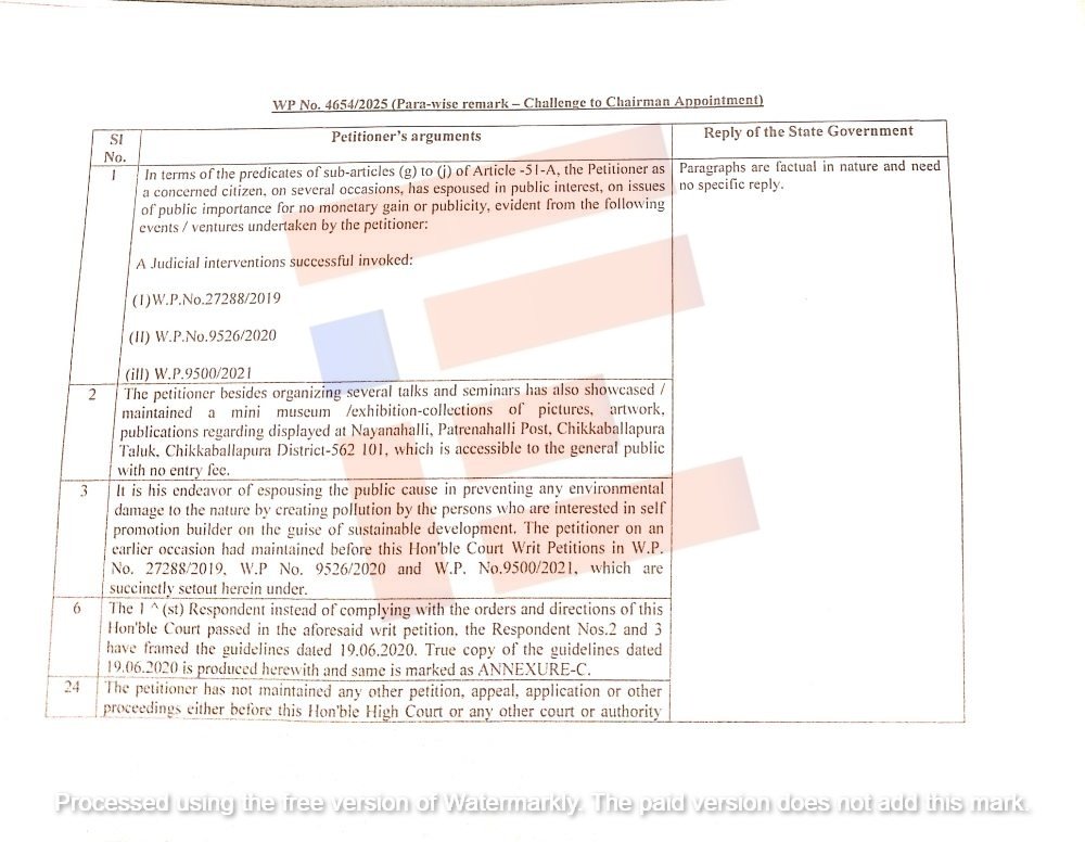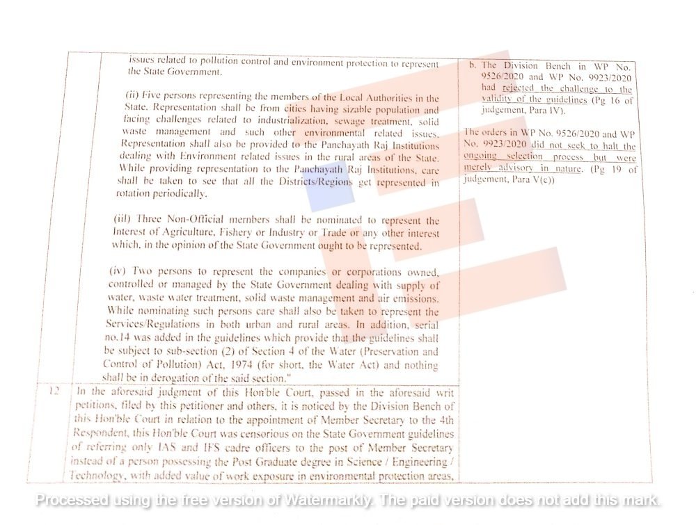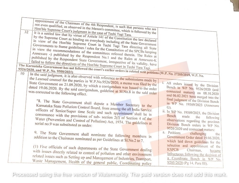 ಈ ಹೈಕೋರ್ಟ್ನ ವಿಭಾಗೀಯ ಪೀಠವು ( wp 9526/2020 ಮತ್ತು 9500/2021 ) ರಲ್ಲಿ ಮತ್ತು ಕರ್ನಾಟಕ ಮಾಲಿನ್ಯ ನಿಯಂತ್ರಣ ಮಂಡಳಿಗೆ ಅಧ್ಯಕ್ಷರನ್ನು ನೇಮಿಸುವಲ್ಲಿ ಸಂಬಂಧಿಸಿದ ವಿಷಯಗಳಲ್ಲಿ ನಿರ್ದೇಶನಗಳನ್ನು ನೀಡಿತ್ತು. ಇದೆಲ್ಲವನ್ನೂ ಗಾಳಿಗೆ ತೂರಲಾಗಿದೆ ಎಂದು ವಿವರಿಸಿದ್ದರು.