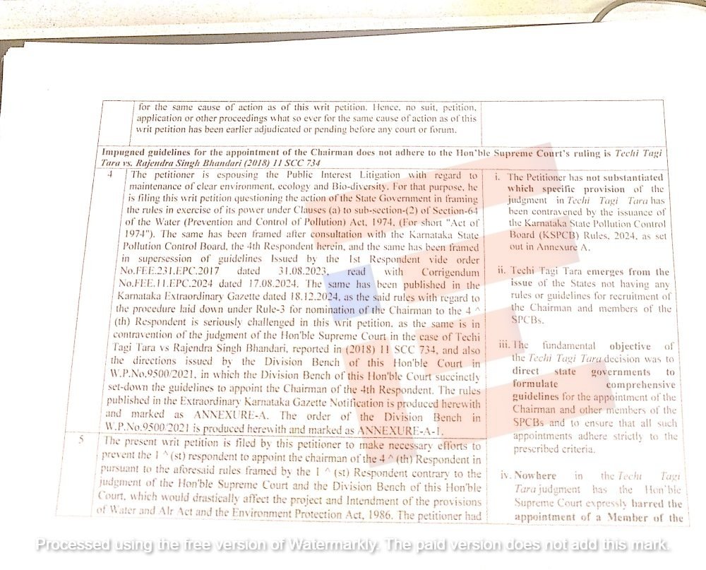 ಅರ್ಜಿಯ ಕ್ರಮ ಸಂಖ್ಯೆಯ 1ರಿಮದ 24ರವೆಗಿನ ಪ್ಯಾರಾಗಳು ವಾಸ್ತವಿಕ ಸ್ವರೂಪದ್ದಾಗಿದೆ. ಇವಕ್ಕೆ ಸ್ಪಷ್ಟ ಉತ್ತರದ ಅಗತ್ಯವಿಲ್ಲ. ಕರ್ನಾಟಕ ರಾಜ್ಯ ಮಾಲಿನ್ಯ ನಿಯಂತ್ರಣ ನಿಯಮಗಳು 2024 ರ ಹೊರಡಿಸುವ ಮೂಲಕ ಟೆಕಿ ತ್ಯಾಗಿ ಪ್ರಕರಣದಲ್ಲಿನ ತೀರ್ಪಿನ ಯಾವ ನಿರ್ದಿಷ್ಟ ನಿಬಂಧನೆಯನ್ನು ಉಲ್ಲಂಘಿಸಲಾಗಿದೆ ಎಂಬುದನ್ನು ಅರ್ಜಿದಾರರು ಸಮರ್ಥಿಸಿಲ್ಲ.