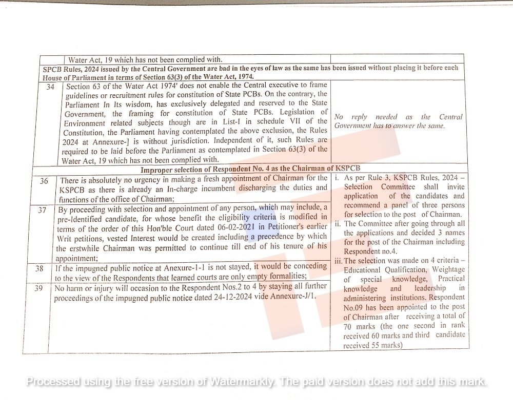 ಆಯ್ಕೆ ಸಮಿತಿಯು ಶಿಫಾರಸು ಮಾಡಿದ 9 ನೇ ಪ್ರತಿವಾದಿಯು 2008, 2013, 2013-2018 ಮತ್ತು 2023-2028 ರಿಂದ ಸತತವಾಗಿ ಕರ್ನಾಟಕ ವಿಧಾನಸಭೆಯ ರಾಜಕಾರಣಿ-ಸದಸ್ಯರಾಗಿದ್ದಾರೆ. 1974 ರ ಜಲ ಕಾಯ್ದೆಯ ಸೆಕ್ಷನ್ 4(2) ಮತ್ತು ವಾಯು ಕಾಯ್ದೆಯ ಅನುಗುಣವಾದ ಸೆಕ್ಷನ್ 5(2)a ನಲ್ಲಿ ಸೂಚಿಸಲಾದ ವಿಶೇಷ ಜ್ಞಾನ ಅಥವಾ ಪ್ರಾಯೋಗಿಕ ಅನುಭವವನ್ನು ಹೊಂದಿಲ್ಲ ಎಂದು ತಕರಾರು ಎತ್ತಿದ್ದರು.