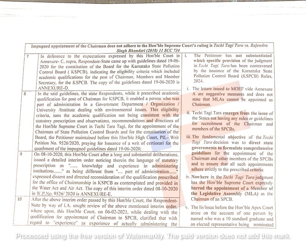 ಕೆಎಸ್ಪಿಸಿಬಿ ಅಧ್ಯಕ್ಷರ ಆಯ್ಕೆ ಮತ್ತು ನೇಮಕಾತಿಗೆ ಮಾರ್ಗಸೂಚಿಗಳಿಗೆ ಸಂಬಂಧಿಸಿದಂತೆ ರಾಜ್ಯ ಸರ್ಕಾರವು ಕಾಲಕಾಲಕ್ಕೆ ಹೊರಡಿಸಿದ್ದ ಆದೇಶಗಳನ್ನು ಪ್ರಶ್ನಿಸಿದ್ದ ರಿಟ್ ಅರ್ಜಿಗಳು ಮತ್ತು ಈ ಸಂಬಂಧ ಆ ಎಲ್ಲಾ ಅರ್ಜಿಗಳು ಹೇಗೆಲ್ಲಾ ನಿಷ್ಪ್ರಯೋಜಕವಾದವು ಎಂದು ಸಾಬೀತುಪಡಿಸುವ ಅಂಶಗಳನ್ನೂ ವಿವರಣೆ ಪಟ್ಟಿಯಲ್ಲಿ ಉಲ್ಲೇಖಿಸಿರುವುದು ಗೊತ್ತಾಗಿದೆ.