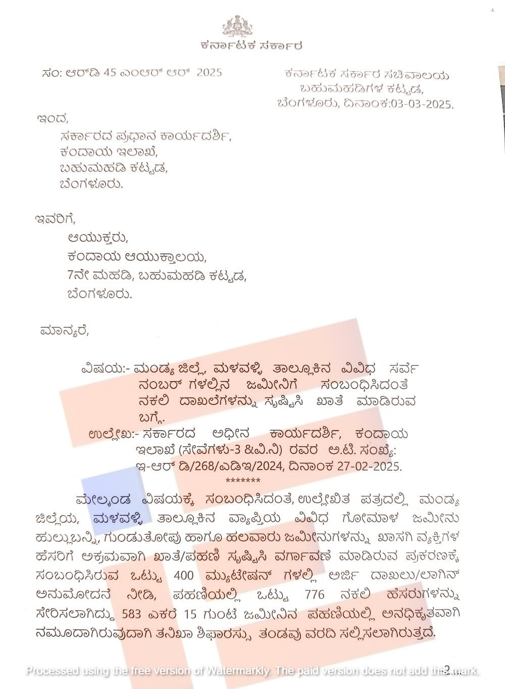 ಬೆಂಗಳೂರು; ಮಂಡ್ಯ ಜಿಲ್ಲೆಯ ಮಳವಳ್ಳಿ ತಾಲೂಕು ವ್ಯಾಪ್ತಿಯ ವಿವಿಧೆಡೆ ಒಟ್ಟು 583 ಎಕರೆ 15 ಗುಂಟೆ ಜಮೀನಿನಲ್ಲಿ 776 ನಕಲಿ ಹೆಸರುಗಳನ್ನು ಸೇರಿಸಿರುವುದನ್ನು ಕೆಎಎಸ್ ಅಧಿಕಾರಿ ಸಂಗಪ್ಪ ನೇತೃತ್ವದ ತನಿಖಾ ತಂಡವು ಪತ್ತೆ ಹಚ್ಚಿದೆ. ಈ ಸಂಬಂಧ ಸರ್ಕಾರಕ್ಕೆ ವರದಿಯನ್ನು ಸಲ್ಲಿಸಿದೆ.