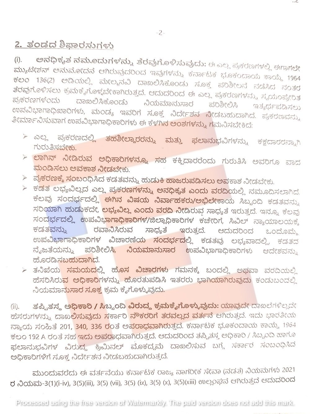 ‘ಯಾವುದೇ ದಾಖಲೆಗಳಿಲ್ಲದೇ ಹೆಸರುಗಳನ್ನು ದಾಖಲಿಸುವುದು ಸರ್ಕಾರಿ ನೌಕರರಿಗೆ ತರವಲ್ಲದ ವರ್ತನೆ ಆಗಿದೆ. ಇದು ಭಾರತೀಯ ನ್ಯಾಯ ಸಂಹಿತೆ 201, 340, 336ರಂತೆ ಅಪರಾಧವಾಗಿರುತ್ತದೆ. ಕರ್ನಾಟಕ ಭೂ ಕಂದಾಯ ಕಾಯ್ದೆ 1964 ಕಲಂ 192 ಎ ರಂತೆ ಸಹ ಇದು ಅಪರಾಧವಾಗಿದೆ. ಆದ್ದರಿಂದ ತಪ್ಪಿತಸ್ಥ ಅಧಿಕಾರಿ, ಸಿಬ್ಬಂದಿ ಹಾಗೂ ಫಲಾನುಭವಿಗಳ ವಿರುದ್ಧ ಕ್ರಿಮಿನಲ್ ಮೊಕದ್ದಮೆ ದಾಖಲಿಸುವ ಬಗ್ಗೆ ಅಧಿಕಾರಿಗಳಿಗೆ ನಿರ್ದೇಶನ ನೀಡಬಹುದು,’ ಎಂದು ತನಿಖಾ ತಂಡವು ಶಿಫಾರಸ್ಸು ಮಾಡಿದೆ.