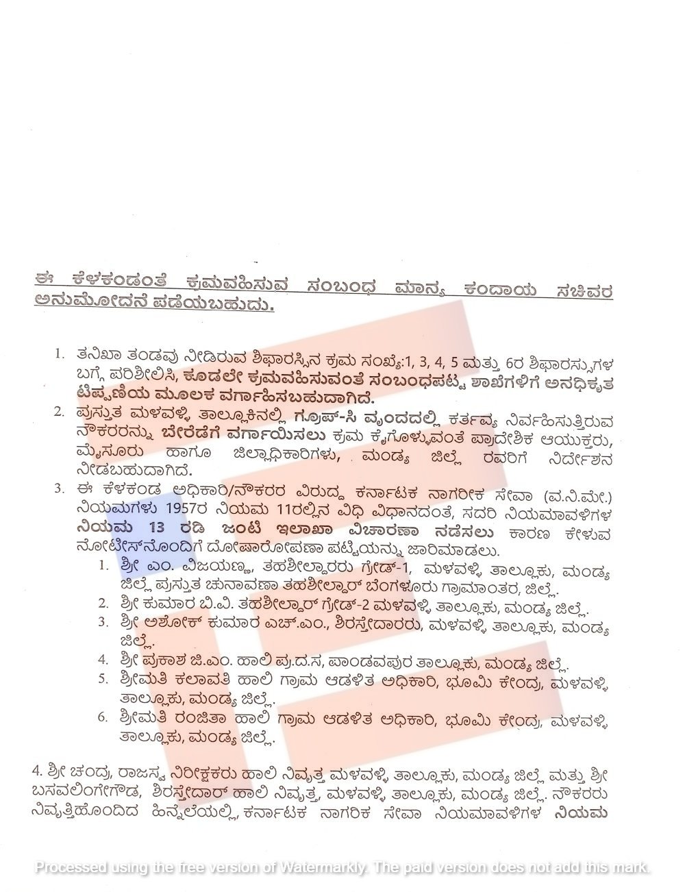 ಈ ಪ್ರಕರಣದಲ್ಲಿ ಭಾಗಿಯಾಗಿದ್ದಾರೆ ಎಂದು ಹೇಳಲಾಗಿರುವ ಮಳವಳ್ಳಿಯಲ್ಲಿ ತಹಶೀಲ್ದಾರ್ ಅಗಿ ಕಾರ್ಯನಿರ್ವಹಿಸಿದ್ದ ಎಂ ವಿಜಯಣ್ಣ, ಕುಮಾರ ಬಿ ವಿ, ಶಿರಸ್ತೆದಾರರಾದ ಅಶೋಕ್ ಕುಮಾರ್ ಎಚ್ ಎಂ, ಪಾಂಡವಪುರ ತಾಲೂಕು ಕಚೇರಿಯ ಪ್ರಥಮ ದರ್ಜೆ ಗುಮಾಸ್ತ ಪ್ರಕಾಶ್ ಜಿ ಎಂ, ಮಳವಳ್ಳಿ ತಾಲೂಕಿನ ಭೂಮಿ ಕೇಂದ್ರದ ಗ್ರಾಮ ಆಡಳಿತಾಧಿಕಾರಿ ಕಲಾವತಿ, ರಂಜಿತಾ, ರಾಜಸ್ವ ನಿರೀಕ್ಷಕ ಚಂದ್ರ, ಬಸವಲಿಂಗೇಗೌಡ ಅವರ ವಿರುದ್ಧ ದೋಷಾರೋಪಣೆ ಪಟ್ಟಿ ಜಾರಿಮಾಡಲು ಇಲಾಖೆಯು ಶಿಫಾರಸ್ಸು ಮಾಡಿರುವುದು ಗೊತ್ತಾಗಿದೆ.