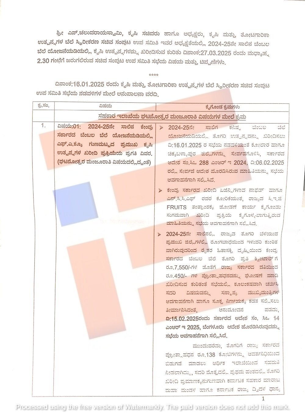 ಕೃಷಿ ಸಚಿವ ಎನ್‌ ಚೆಲುವರಾಯಸ್ವಾಮಿ ಅವರ ಅಧ್ಯಕ್ಷತೆಯಲ್ಲಿರುವ  ಕೃಷಿ ಮತ್ತು ತೋಟಗಾರಿಕೆ ಉತ್ಪನ್ನಗಳ ಬೆಲೆ ಸ್ಥಿರೀಕರಣದ ಸಚಿವ ಸಂಪುಟ ಉಪ ಸಮಿತಿ ಸಭೆಯು 2025ರ ಮಾರ್ಚ್‌ 27ರಂದು ನಡೆಯಲಿರುವ ಸಭೆಗೆ ಸಹಕಾರ ಇಲಾಖೆಯು ಮಂಡಿಸಿರುವ ಟಿಪ್ಪಣಿಯಲ್ಲಿ 5.46 ಕೋಟಿ ರು.ಗಳನ್ನು ಮರು ಪಾವತಿ ಮಾಡಿಲ್ಲ ಎಂದು ವಿವರಿಸಿದೆ.
