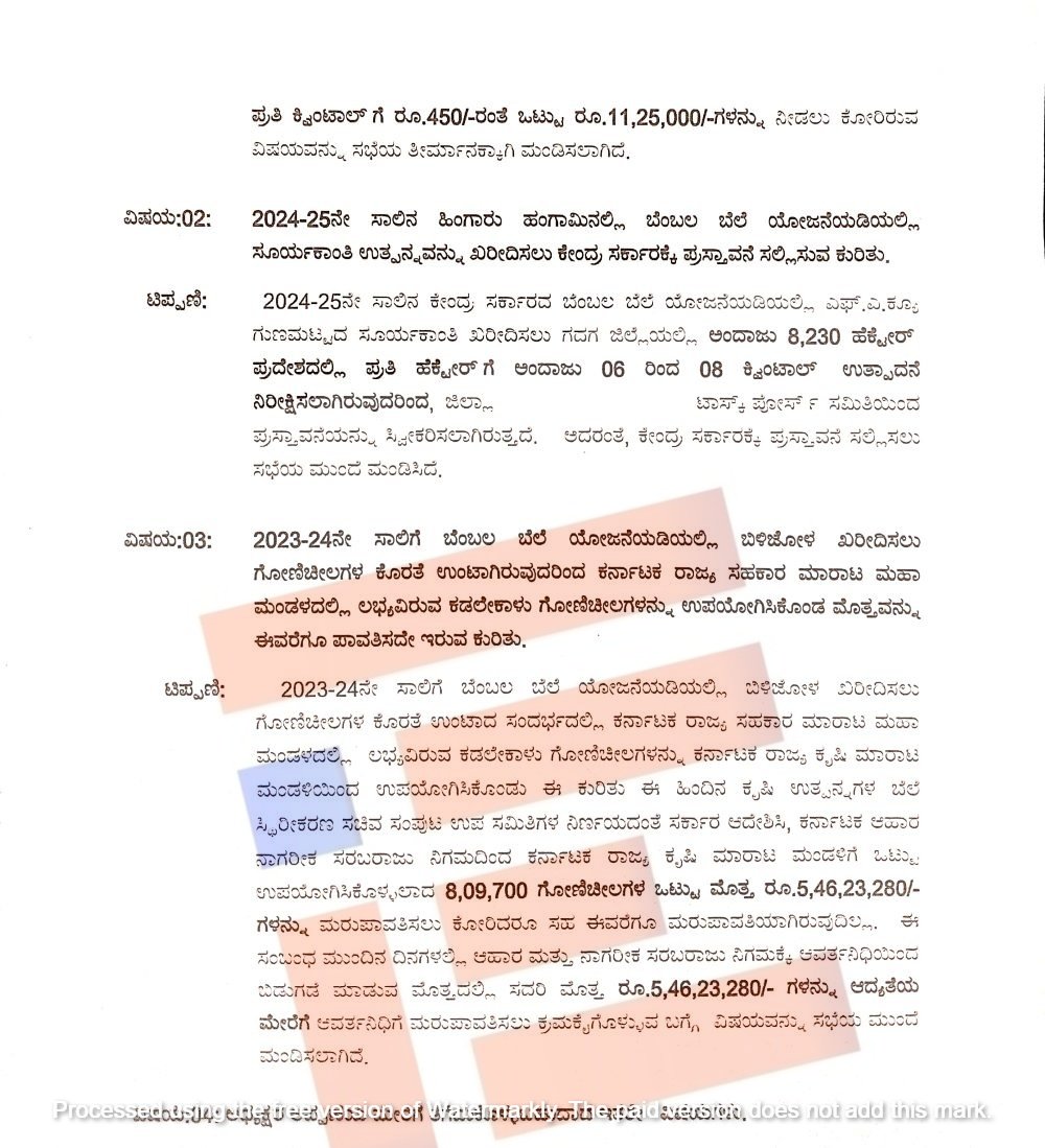 2023-24ನೇ ಸಾಲಿಗೆ ಬೆಂಬಲ ಬೆಲೆ ಯೋಜನೆಯಡಿಯಲ್ಲಿ ಬಿಳಿಜೋಳ ಖರೀದಿಸಲು ಗೋಣಿಚೀಲಗಳ ಕೊರತೆ ಉಂಟಾಗಿತ್ತು. ಇದಕ್ಕಾಗಿ ಕರ್ನಾಟಕ ರಾಜ್ಯ ಸಹಕಾರ ಮಾರಾಟ ಮಹಾ ಮಂಡಳದಲ್ಲಿ ಲಭ್ಯವಿದ್ದ 8,09,700  ಗೋಣಿಚೀಲಗಳನ್ನು ಸರ್ಕಾರವು ಖರೀದಿಸಿತ್ತು. ಈ ಸಂಬಂಧ 5,46,23,280 ರು.ಗಳನ್ನು ಕರ್ನಾಟಕ ರಾಜ್ಯ ಸಹಕಾರ ಮಾರಾಟ ಮಹಾಮಂಡಲದಲ್ಲಿ  ಪಾವತಿಸಬೇಕಿತ್ತು. ಈ ಕುರಿತು ಮಂಡಳವು ಹಲವಾರು ಬಾರಿ ಕೋರಿದರೂ ಸಹ ಇದುವರೆಗೂ ಮರುಪಾವತಿಯಾಗಿಲ್ಲ ಎಂದು ಟಿಪ್ಪಣಿಯಿಂದ ಗೊತ್ತಾಗಿದೆ.