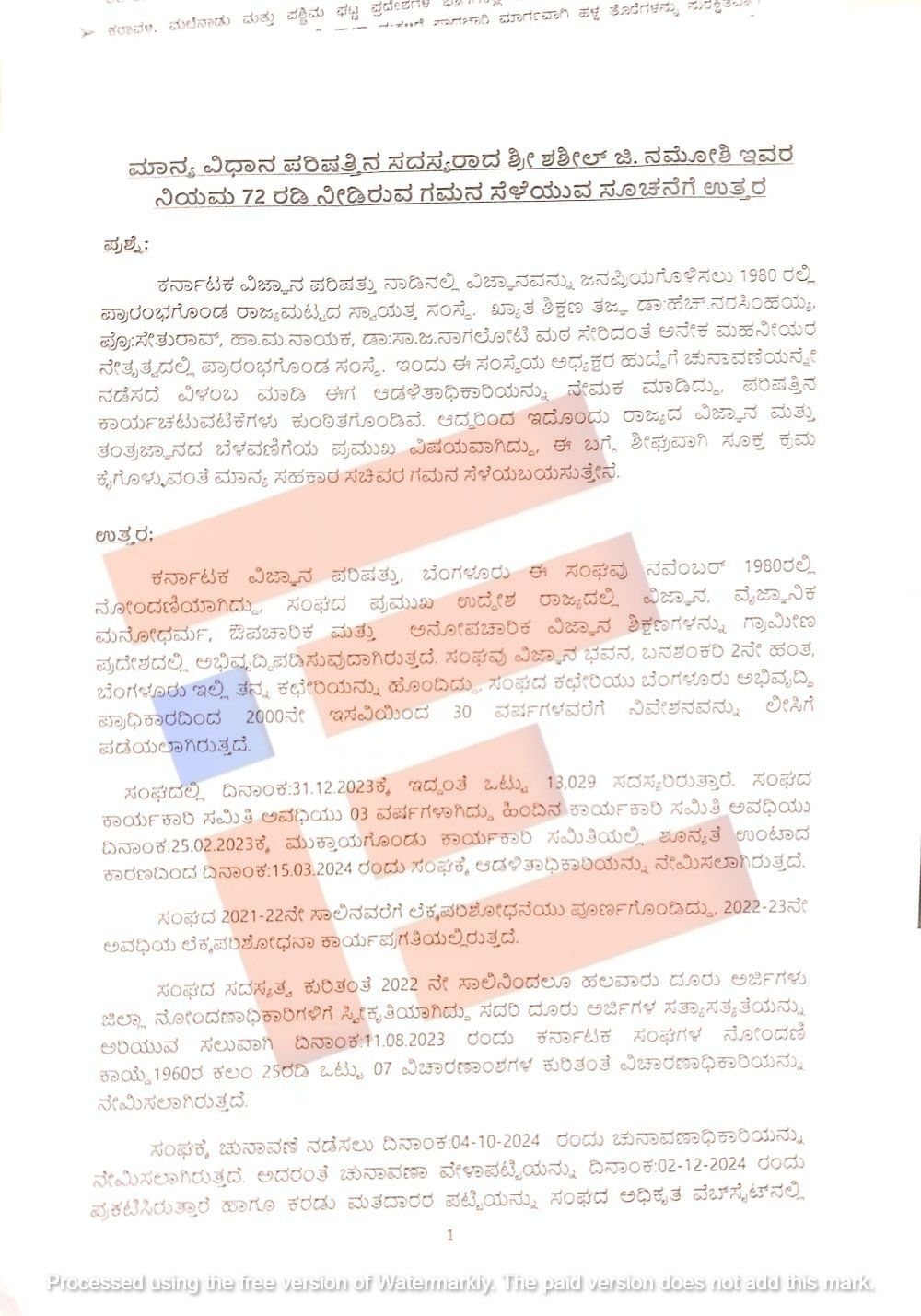 ಈ ಕುರಿತು ಸಹಕಾರ ಸಚಿವ ಕೆ ಎನ್ ರಾಜಣ್ಣ ಅವರು ವಿಧಾನ ಪರಿಷತ್ನಲ್ಲಿ ಶಶಿಲ್ ಜಿ ನಮೋಶಿ ಅವರ ಗಮನಸೆಳೆಯುವ ಸೂಚನೆಗೆ ಉತ್ತರ ಒದಗಿಸಿದ್ದಾರೆ. ಇದರ ಪ್ರತಿಯು ‘ದಿ ಫೈಲ್’ಗೆ ಲಭ್ಯವಾಗಿದೆ.