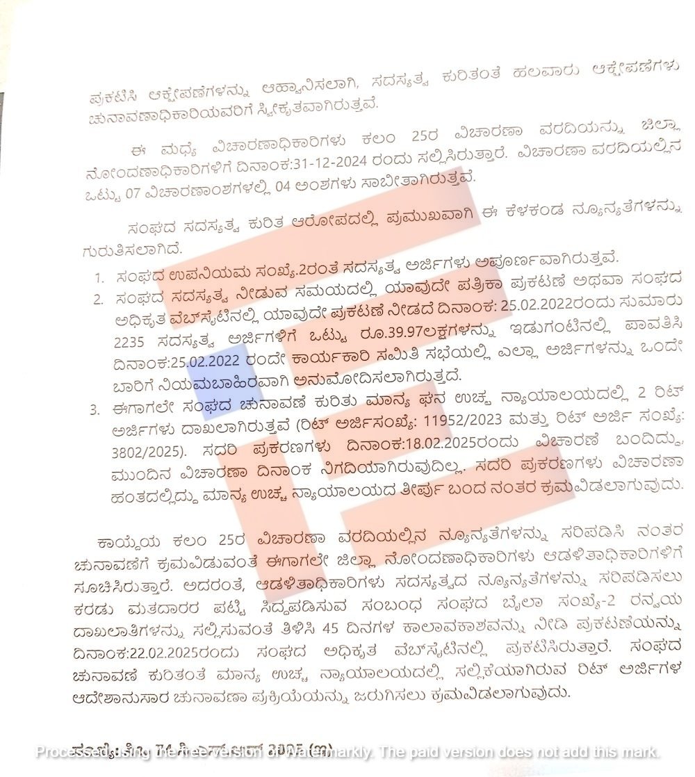 ಅದೇ ರಿತಿ ಸಂಘದ ಚುನಾವಣೆ ಕುರಿತು ಉಚ್ಛ ನ್ಯಾಯಾಲಯದಲ್ಲಿ 2 ರಿಟ್ ಅರ್ಜಿಗಳು ದಾಖಲಾಗಿವೆ. 2025ರ ಫೆ.18ರಂದು ಈ ಅರ್ಜಿಗಳು ವಿಚಾರಣೆಗೆ ಬಂದಿವೆ. ಮುಂದಿನ ವಿಚಾರಣೆ ದಿನಾಂಕ ನಿಗದಿಯಾಗಿಲ್ಲ. ಈ ಪ್ರಕರಣಗಳು ವಿಚಾರಣೆ ಹಂತದಲ್ಲಿವೆ. ಉಚ್ಛ ನ್ಯಾಯಾಲಯದ ತೀರ್ಪು ಬಂದ ನಂತರ ಕ್ರಮ ವಹಿಸಲಾಗುತ್ತದೆ ಎಂದು ಉತ್ತರಿಸಿರುವುದು ತಿಳಿದು ಬಂದಿದೆ.