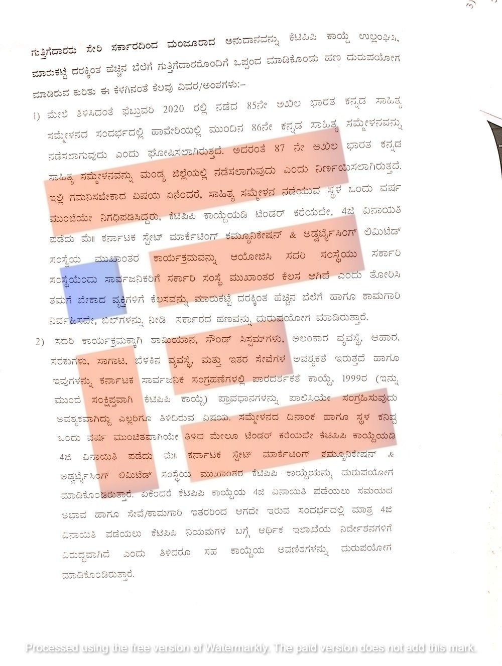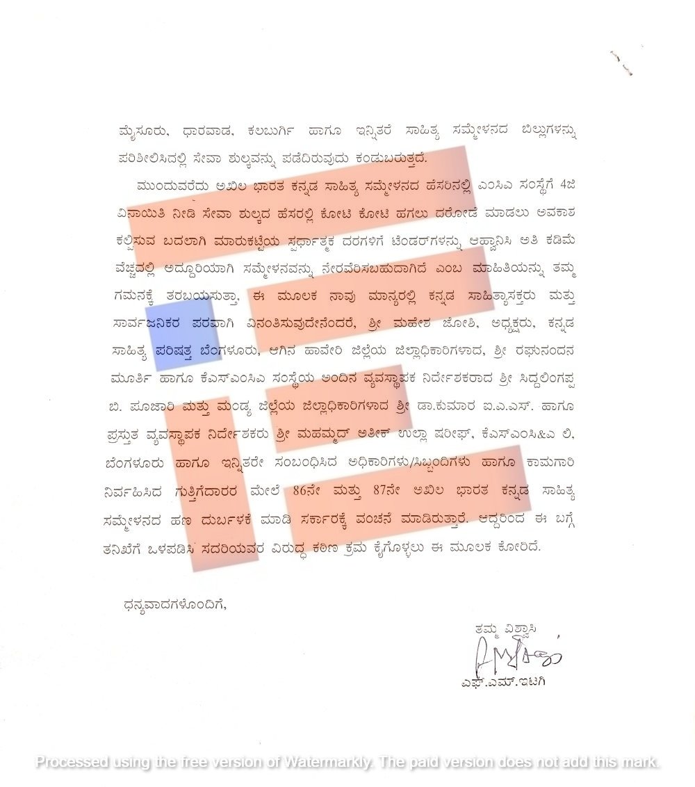 2020ರಲ್ಲಿ 85ನೇ ಅಖಿಲ ಭಾರತ ಕನ್ನಡ ಸಾಹಿತ್ಯ ಸಮ್ಮೇಳನ ಸಂದರ್ಭದಲ್ಲಿ ಹಾವೇರಿಯಲ್ಲಿ 86ನೇ ಸಾಹಿತ್ಯ ಸಮ್ಮೇಳನ ಮತ್ತು ಹಾವೇರಿಯಲ್ಲಿ ನಡೆದಿದ್ದ ಸಾಹಿತ್ಯ ಸಮ್ಮೇಳನ ಸಂದರ್ಭದಲ್ಲಿ 87ನೇ ಸಾಹಿತ್ಯ ಸಮ್ಮೇಳನವನ್ನು ಮಂಡ್ಯದಲ್ಲಿ ಆಯೋಜಿಸಲಾಗುವುದು ಎಂದು ಘೋಷಿಸಲಾಗಿತ್ತು. ಸಾಹಿತ್ಯ ಸಮ್ಮೇಳನ ನಡೆಯುವ ಸ್ಥಳವನ್ನು ಒಂದು ವರ್ಷದ ಮುಂಚೆಯೇ ನಿಗದಿಪಡಿಸಿದ್ದರೂ ಸಹ ಈ ಎರಡೂ ಸಾಹಿತ್ಯ ಸಮ್ಮೇಳನಗಳ ಕಾರ್ಯಕ್ರಮ ಆಯೋಜನೆಗೆ ಕೆಟಿಪಿಪಿ ಕಾಯ್ದೆಯಡಿ ಟೆಂಡರ್‍‌ ಕರೆದಿರಲಿಲ್ಲ.  4 (ಜಿ) ವಿನಾಯಿತಿ ಪಡೆದು ಕೆಎಸ್‌ಎಂಸಿಎ ಮೂಲಕ ಕಾರ್ಯಕ್ರಮ ಆಯೋಜಿಸಲಾಗಿದೆ ಎಂದು ದೂರಿನಲ್ಲಿ ವಿವರಿಸಿರುವುದು ತಿಳಿದು ಬಂದಿದೆ.