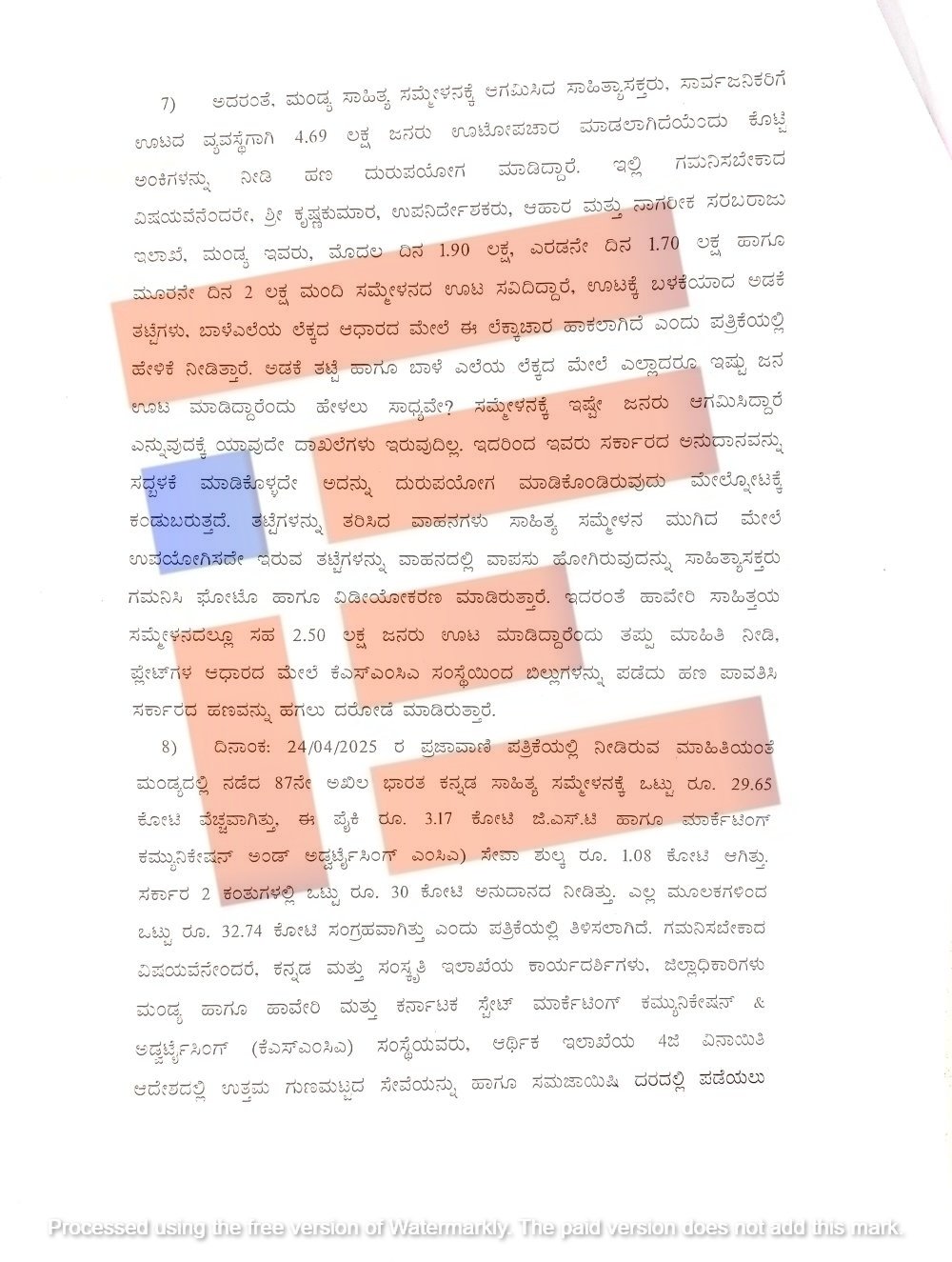 ಮಂಡ್ಯ ಸಾಹಿತ್ಯ ಸಮ್ಮೇಳನಕ್ಕೆ ಆಗಮಿಸಿದ ಸಾಹಿತ್ಯಾಸಕ್ತರು, ಸಾರ್ವಜನಿಕರಿಗೆ ಊಟದ ವ್ಯವಸ್ಥೆಗಾಗಿ 4.69   ಲಕ್ಷ ಜನರು ಊಟೋಪಚಾರ ಮಾಡಲಾಗಿದೆಯೆಂದು ಖೊಟ್ಟಿ  ಅಂಕಿಗಳನ್ನು ನೀಡಿ ಹಣ ದುರುಪಯೋಗ ಮಾಡಿದ್ದಾರೆ. ಎಂದು ಆಪಾದಿಸಲಾಗಿದೆ.