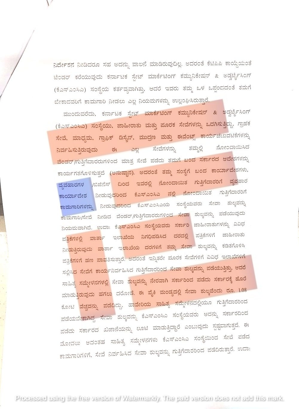 ಕೆಎಸ್‌ಎಂಸಿಎಯು ಸರ್ಕಾರಿ ಜಾಹೀರಾತುಗಳನ್ನು ವಿವಿಧ ಪತ್ರಿಕೆಗಳಿಗೆ ವಾರ್ತಾ ಇಲಾಖೆ ನಿಗದಿಪಡಿಸಿರುವ ದರದಲ್ಲಿ ಜಾಹೀರಾತು ನೀಡುತ್ತದೆ. ವಾರ್ತಾ ಇಲಾಖೆಯು ಈ ದರಗಳಿಗೆ ಸೇವಾ ಶುಲ್ಕವನ್ನು ಕಡಿತಗೊಳಿಸಿ ಪತ್ರಿಕೆಗಳಿಗೆ ಹಣ ಪಾವತಿಸುತ್ತಿದೆ. ಇನ್ನಿತರೆ ಪೂರಕ ಸೇವೆಗಳಿಗೂ ವಿವಿಧ ಇಲಾಖೆಗಳಿಗೆ ಸಲ್ಲಿಸಿದ ಸೇವೆ ನಿರ್ವಹಿಸುವ ಗುತ್ತಿಗೆದಾರರಿಂದ ಸೇವಾ ಶುಲ್ಕ ಪಡೆಯುತ್ತಿತ್ತು. ಆದರೆ ಸಾಹಿತ್ಯ ಸಮ್ಮೇಳನದಲ್ಲಿ ಸೇವಾ ಶುಲ್ಕವನ್ನು ಸರ್ಕಾರದಿಂದ ಪಡೆದು ಹೊರೆ ಮಾಡಿದೆ ಎಂದು ದೂರುದಾರರು ವಿವರಿಸಿರುವುದು ಗೊತ್ತಾಗಿದೆ.