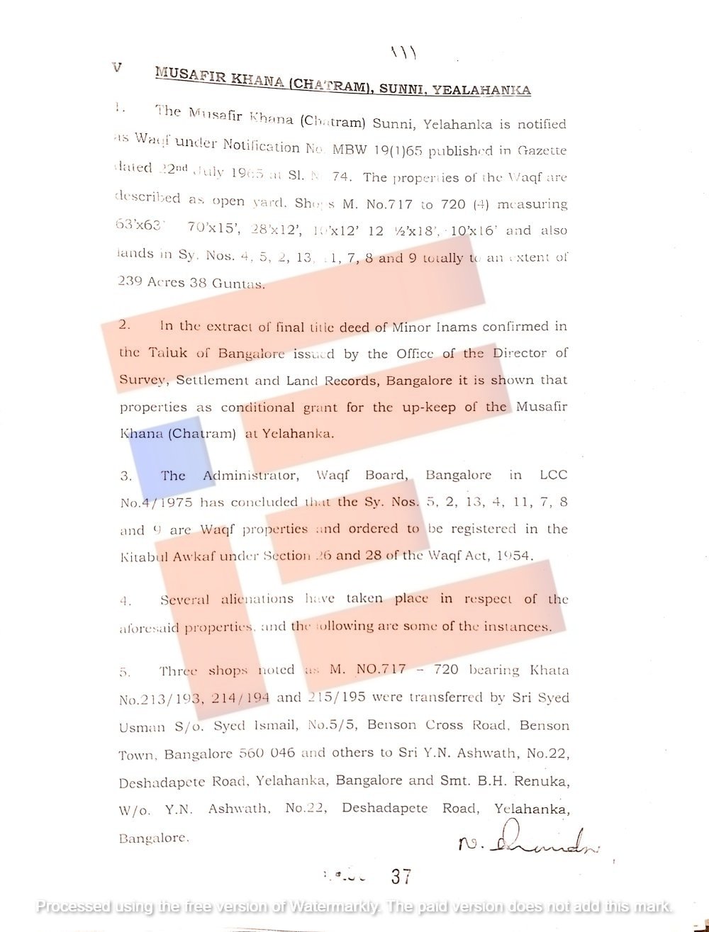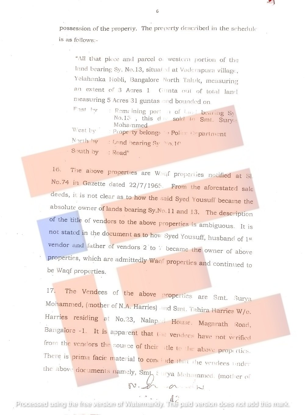 ಈ ಆಸ್ತಿಗಳು (22/7/1965 ) ಗೆಜೆಟ್ನಲ್ಲಿ (ಸಂಖ್ಯೆ 74 ರಲ್ಲಿ) ಸೂಚಿತ ವಕ್ಫ್ ಆಸ್ತಿಗಳಾಗಿವೆ. ಮಾರಾಟ ಪತ್ರಗಳಿಂದ,ಹೇಳಲಾದ ಸೈಯದ್ ಯೂಸುಫ್ ಸರ್ವೆ ಸಂಖ್ಯೆ 11 ಮತ್ತು 13 ರ ಜಮೀನುಗಳ ಸಂಪೂರ್ಣ ಮಾಲೀಕರಾದರು ಎಂಬುದು ಸ್ಪಷ್ಟವಾಗಿಲ್ಲ. ಈ ಆಸ್ತಿಗಳಿಗೆ ಮಾರಾಟಗಾರರ ಟೈಟಲ್ ವಿವರಣೆಯು ಅಸ್ಪಷ್ಟವಾಗಿದೆ. ಮೊದಲ ಮಾರಾಟಗಾರರ ಪತಿ ಮತ್ತು 2 ರಿಂದ 7 ಮಾರಾಟಗಾರರ ತಂದೆ ಸೈಯದ್ ಯೂಸಫ್ ಮೇಲಿನ ಆಸ್ತಿಗಳಿಗೆ ಹೇಗೆ ಮಾಲೀಕರಾದರು ಎಂಬುದನ್ನು ದಾಖಲೆಯಲ್ಲಿ ಹೇಳಲಾಗಿಲ್ಲ. ಇವು ವಕ್ಫ್ ಆಸ್ತಿಗಳೆಂದು ಒಪ್ಪಿಕೊಳ್ಳಲಾಗಿದೆ ಮತ್ತು ವಕ್ಫ್ ಆಸ್ತಿಗಳಾಗಿಯೇ ಮುಂದುವರೆದಿದೆ ಎಂದು ಉಪ ಲೋಕಾಯುಕ್ತರ ತನಿಖಾ ವರದಿಯಲ್ಲಿ ವಿವರಿಸಿರುವುದು ತಿಳಿದು ಬಂದಿದೆ.