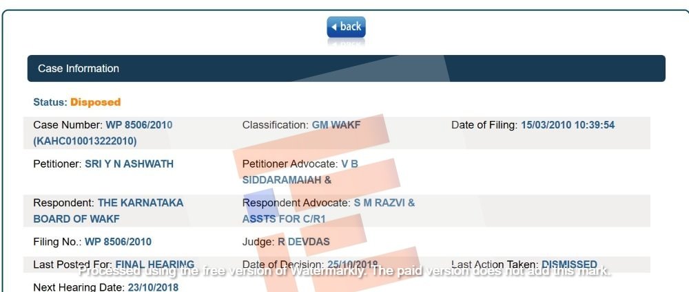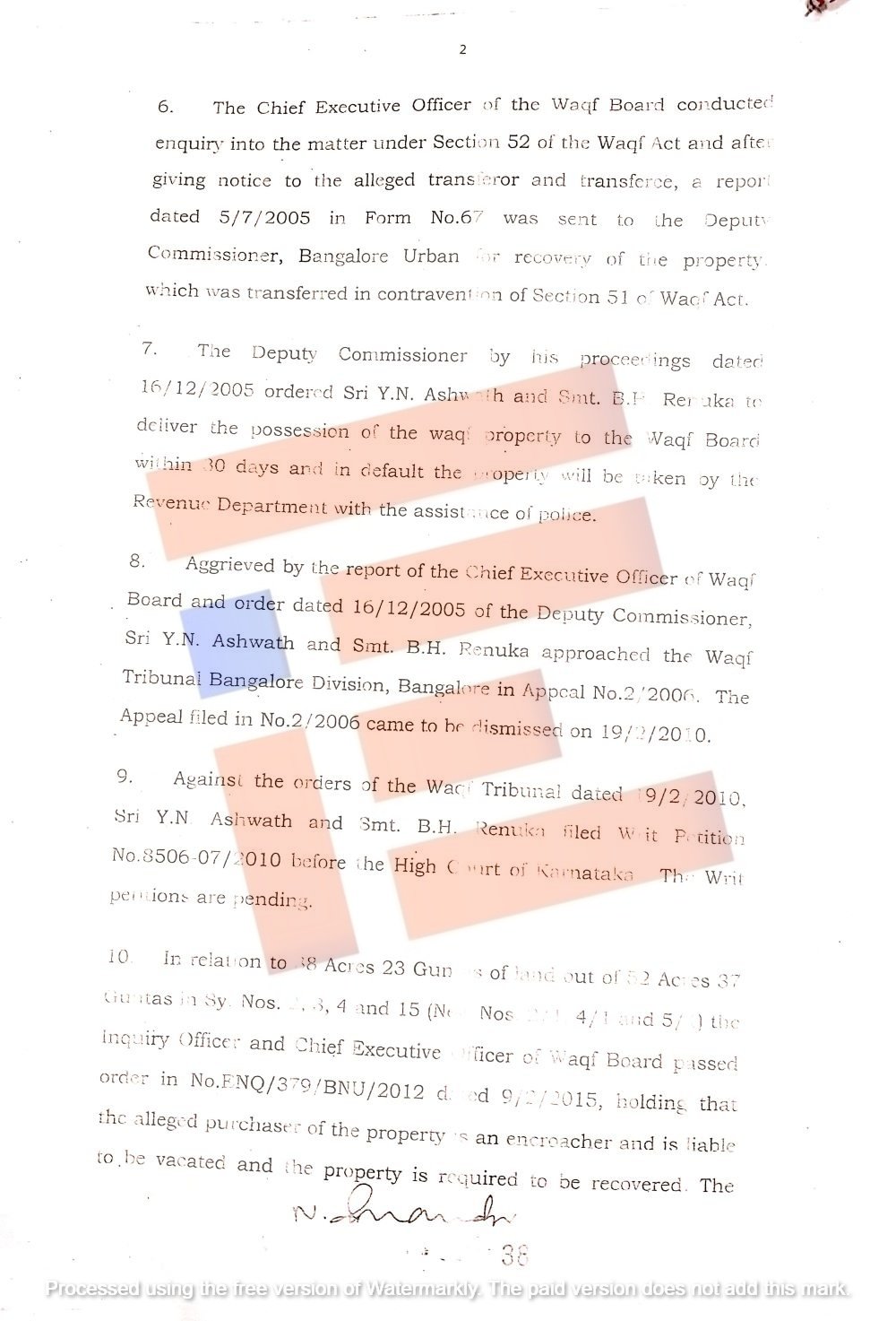 ವಕ್ಫ್ ಮಂಡಳಿಯ ಮುಖ್ಯ ಕಾರ್ಯನಿರ್ವಾಹಕ ಅಧಿಕಾರಿಯ ವರದಿ ಮತ್ತು ಜಿಲ್ಲಾಧಿಕಾರಿ ಹೊರಡಿಸಿದ್ದ ಆದೇಶವನ್ನು ವೈ ಎನ್ ಅಶ್ವತ್ ಮತ್ತು ಬಿ ಎಚ್ ರೇಣುಕಾ ಎಂಬುವರು ವಕ್ಫ್ನ ನ್ಯಾಯ ಮಂಡಳಿಯಲ್ಲಿ ಮೇಲ್ಮನವಿ ಮೂಲಕ 2010 ಫೆಬ್ರವರಿ 19 ರಂದು ಪ್ರಶ್ನಿಸಿದ್ದರು. ನಂತರ ಹೈಕೋರ್ಟ್ನಲ್ಲಿಯೂ ರಿಟ್ ಅರ್ಜಿಯನ್ನು ಸಲ್ಲಿಸಿದ್ದರು. ಈ ಅರ್ಜಿಯು 2012ರವರೆಗೆ ಹೈಕೋರ್ಟ್ನಲ್ಲಿ ಬಾಕಿ ಇತ್ತು. 2018ರಲ್ಲಿ ಅರ್ಜಿಯು ವಜಾಗೊಂಡಿರುವುದು ಗೊತ್ತಾಗಿದೆ.