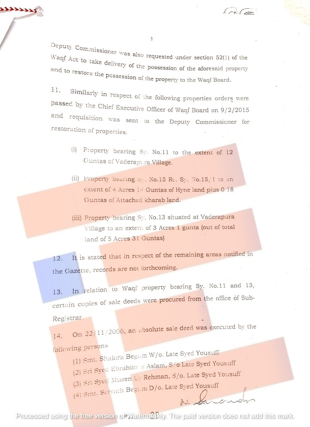 ವಡೇರಪುರ ಗ್ರಾಮದ ಸರ್ವೆ ನಂಬರ್ 11ರಲ್ಲಿನ 12 ಗುಂಟೆ, ಸರ್ವೆ ಸಂಖ್ಯೆ 15 ರ ಆಸ್ತಿ ಹೊಂದಿರುವ 4 ಎಕರೆ ಮತ್ತು 14 ಗುಂಟೆ, 0.18 ಗುಂಟೆಯ ಖರಾಬು ಭೂಮಿ, ಸರ್ವೆ ನಂಬರ್ 13ರಲ್ಲಿನ 3 ಎಕರೆ 1 ಗುಂಟೆ (ಒಟ್ಟು 5 ಎಕರೆ 31 ಗುಂಟಾಗಳ ಭೂಮಿಯಲ್ಲಿ) ಯನ್ನು ವಕ್ಫ್ ಎಂದು ಗೆಜೆಟ್ನಲ್ಲಿ ಅಧಿಸೂಚಿಸಿತ್ತು. ಉಳಿದ ಪ್ರದೇಶಗಳಿಗೆ ಸಂಬಂಧಿಸಿದಂತೆ ದಾಖಲೆಗಳು ಲಭ್ಯವಿರಲಿಲ್ಲ. ಮತ್ತು ಸರ್ವೆ ನಂಬರ್ 11 ಮ್ತು 13ಕ್ಕೆ ಸಂಬಂಧಿಸಿದಂತೆ ಕೆಲವು ಮಾರಾಟ ಪತ್ರಗಳ ಪ್ರತಿಗಳನ್ನು ಉಪ ನೋಂದಣಿದಾರರ ಕಚೇರಿಯಿಂದ ಉಪ ಲೋಕಾಯುಕ್ತರ ನೇತೃತ್ವದ ತನಿಖಾ ತಂಡವು ಪಡೆದಿತ್ತು.