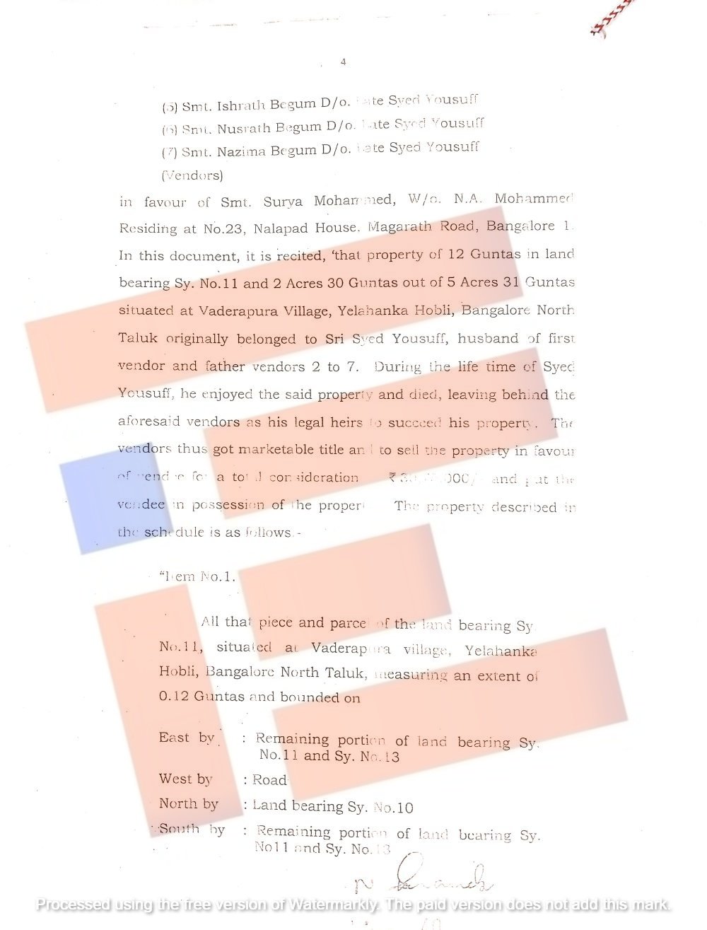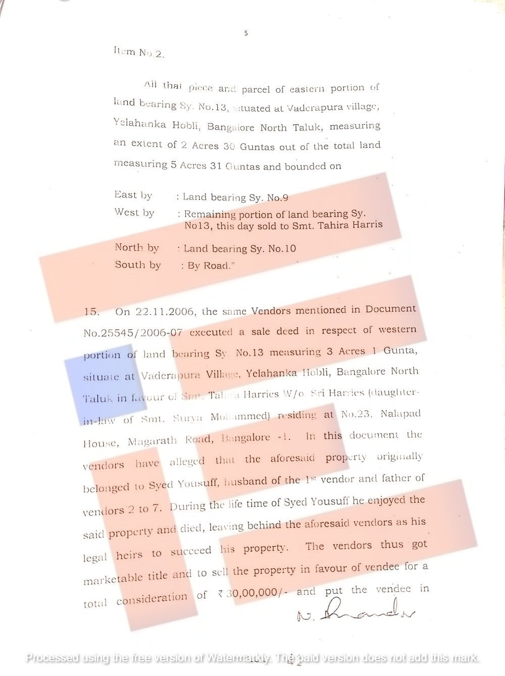 ಈ ಭೂಮಿಗೆ ಸಂಬಂಧಿಸಿದಂತೆ 2006ರ ನವೆಂಬರ್ 22ರಂದು ಶಕೀರಾ ಬೇಗಂ, ಸೈಯದ್ ಇಬ್ರಾಹಿಂ, ಸೈಯದ್ ಮುಯಿನ್ ಉರ್ ರೆಹಮ್ನಾ, ಸರ್ವತ್ ಬೇಗಂ ಇಶ್ರತ್ ಬೇಗಂ, ನುಸ್ರತ್ ಬೇಗಂ, ನಜೀಮಾ ಬೇಗಂ (ಮಾರಾಟಗಾರರು) ಆಬ್ಸಲೂಟ್ ಸೇಲ್ ಡೀಡ್ಗಳನ್ನು ಕಾರ್ಯಗತಗೊಳಿಸಿದ್ದರು.