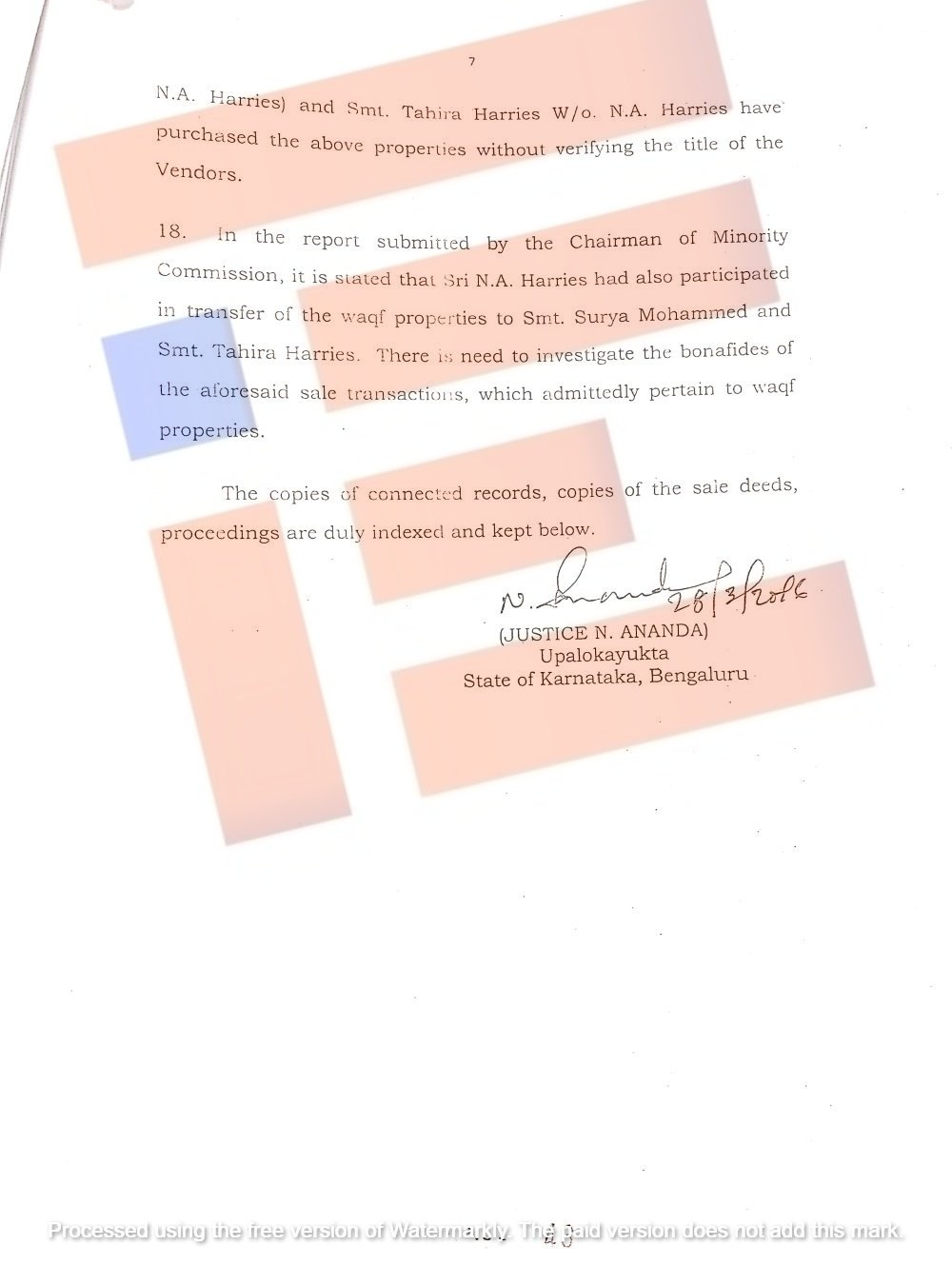 ಅಲ್ಪಸಂಖ್ಯಾತ ಆಯೋಗದ ಅಧ್ಯಕ್ಷರೂ ಸಹ ವರದಿಯನ್ನು ಸಲ್ಲಿಸಿದ್ದಾರೆ. ವಕ್ಫ್ ಆಸ್ತಿಗಳನ್ನು ಎನ್ ಎ ಹ್ಯಾರೀಸ್ ಅವರು ಸುರಯ್ಯಾ ಮೊಹಮದ್ ಮತ್ತು ತಾಹೀರ್ ಹ್ಯಾರೀಸ್ ಅವರ ಹೆಸರಿನಲ್ಲಿ ಖರೀದಿ ಮತ್ತು ವರ್ಗಾಯಿಸುವ ಪ್ರಕ್ರಿಯೆಯಲ್ಲಿ ಭಾಗಿಯಾಗಿದ್ದಾರೆ ಎಂದುಅ ಹೇಳಲಾಗಿದೆ ಎಂದು ಪ್ರಸ್ತಾವಿಸಿರುವ ಉಪ ಲೋಕಾಯುಕ್ತ ಎನ್ ಆನಂದ್ ಅವರು ಈ ಮಾರಾಟ ವಹಿವಾಟುಗಳ ಪ್ರಾಮಾಣಿಕತೆಯನ್ನು ತನಿಖೆ ಮಾಡುವ ಅವಶ್ಯಕತೆಯಿದೆ ಮತ್ತು ಇದು ವಕ್ಫ್ ಆಸ್ತಿಗಳಿಗೆ ಸಂಬಂಧಿಸಿದೆ ಎಂದು ಒಪ್ಪಿಕೊಳ್ಳಬಹುದು ಎಂದು ಸಹ ಅಭಿಪ್ರಾಯಿಸಿದ್ದರು.