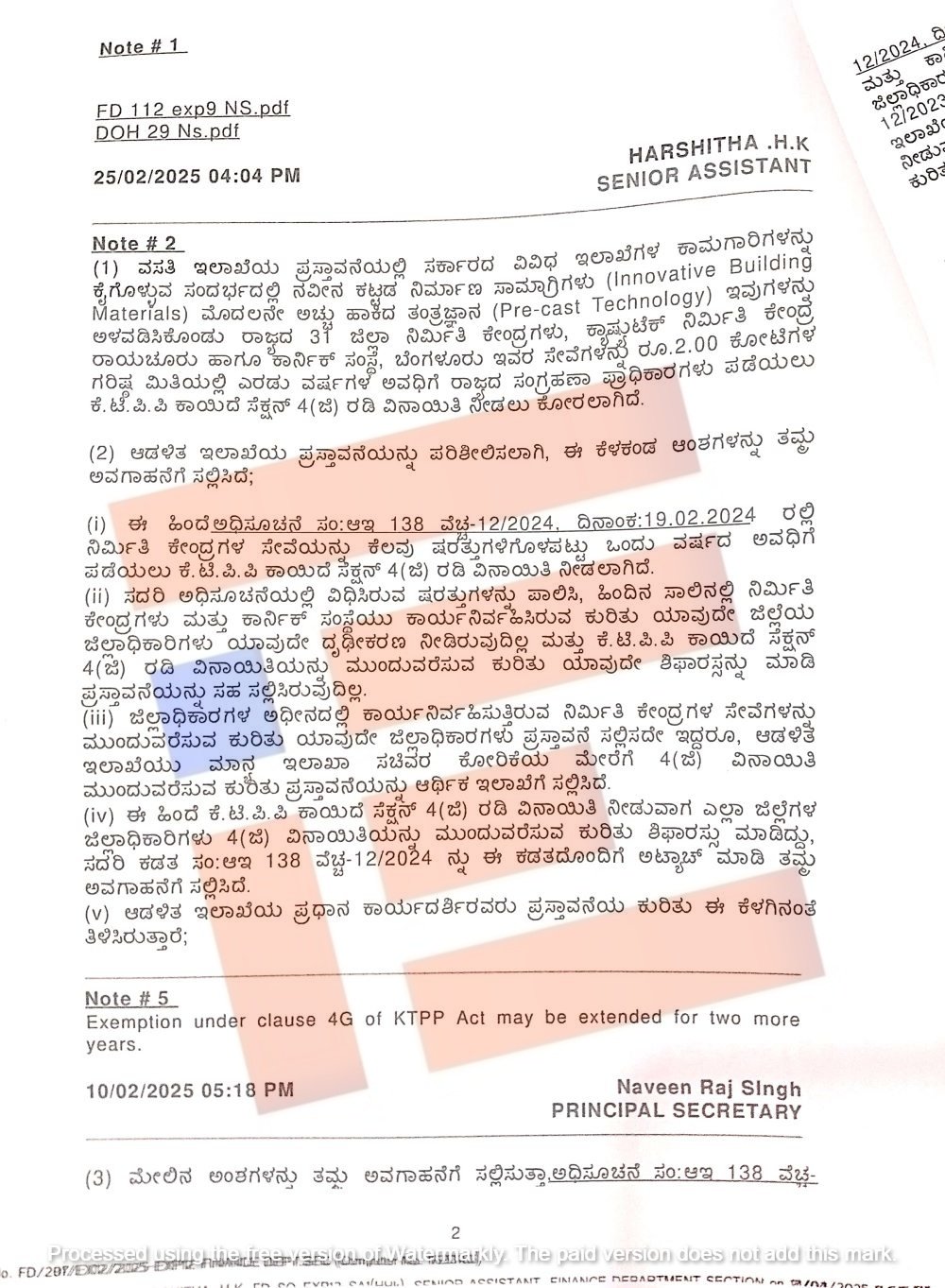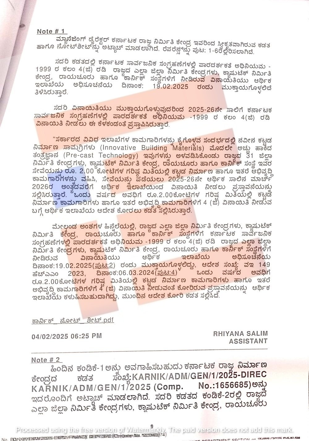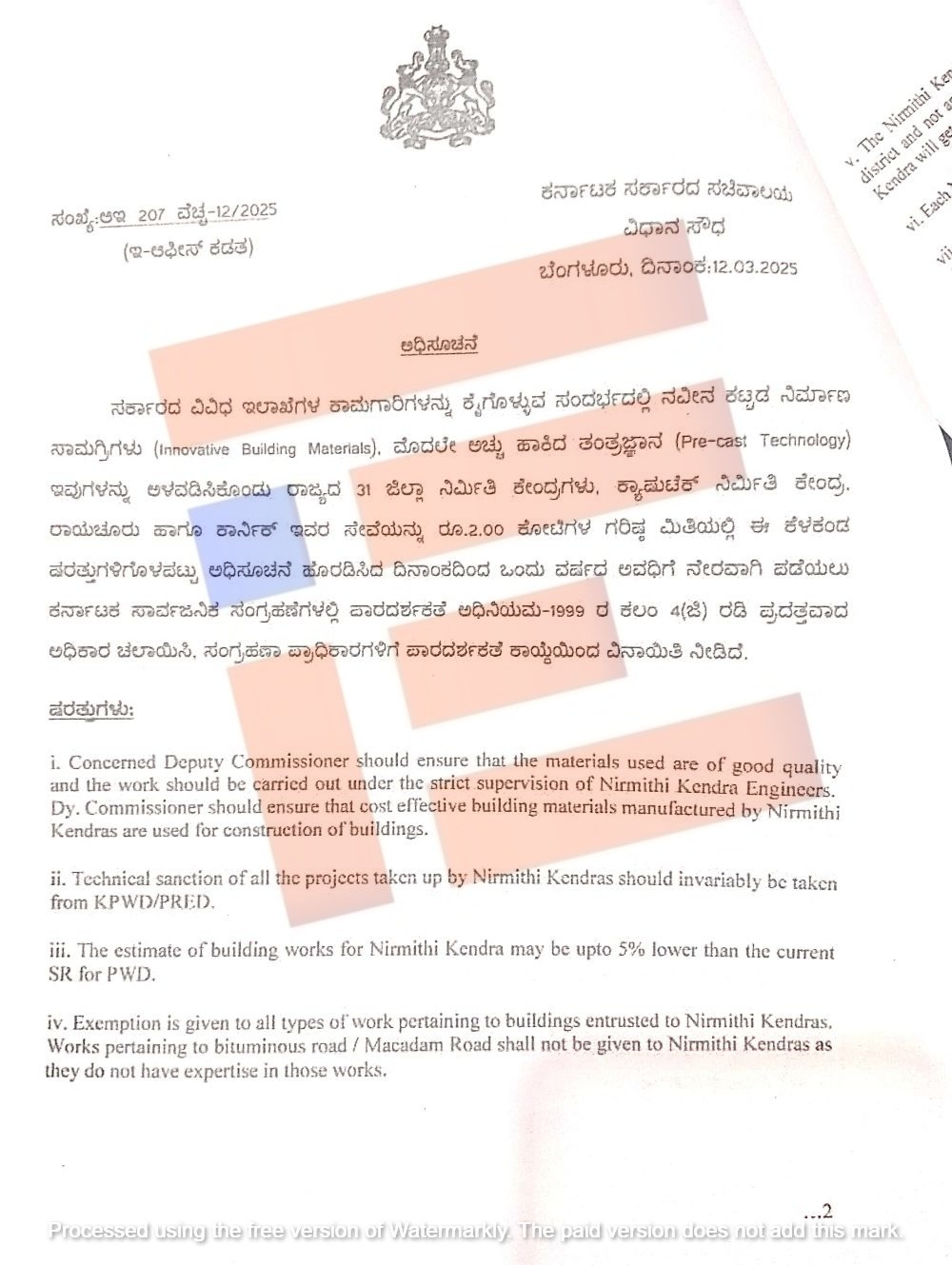 ‘ಜಿಲ್ಲಾಧಿಕಾರಿಗಳ ಅಧೀನದಲ್ಲಿ ಕಾರ್ಯನಿರ್ವಹಿಸುತ್ತಿರುವ ನಿರ್ಮಿತಿ ಕೇಂದ್ರಗಳ ಸೇವೆಗಳನ್ನು ಮುಂದುವರೆಸುವ ಕುರಿತು ಯಾವುದೇ ಜಿಲ್ಲಾಧಿಕಾರಿಗಳು ಪ್ರಸ್ತಾವನೆ ಸಲ್ಲಿಸದೇ ಇದ್ರೂ ಆಡಳಿತ ಇಲಾಖೆಯು ಇಲಾಖೆ ಸಚಿವರ ಕೋರಿಕೆ ಮೇರೆಗೆ 4 (ಜಿ) ವಿನಾಯಿತಿ ಮುಂದುವರೆಸುವ ಪ್ರಸ್ತಾವನೆ ಸಲ್ಲಿಸಿದೆ,’ ಎಂದು ಆರ್ಥಿಕ ಇಲಾಖೆಯ ಟಿಪ್ಪಣಿ ಹಾಳೆಯಲ್ಲಿ ದಾಖಲಿಸಿರುವುದು ಕಂಡು ಬಂದಿದೆ.