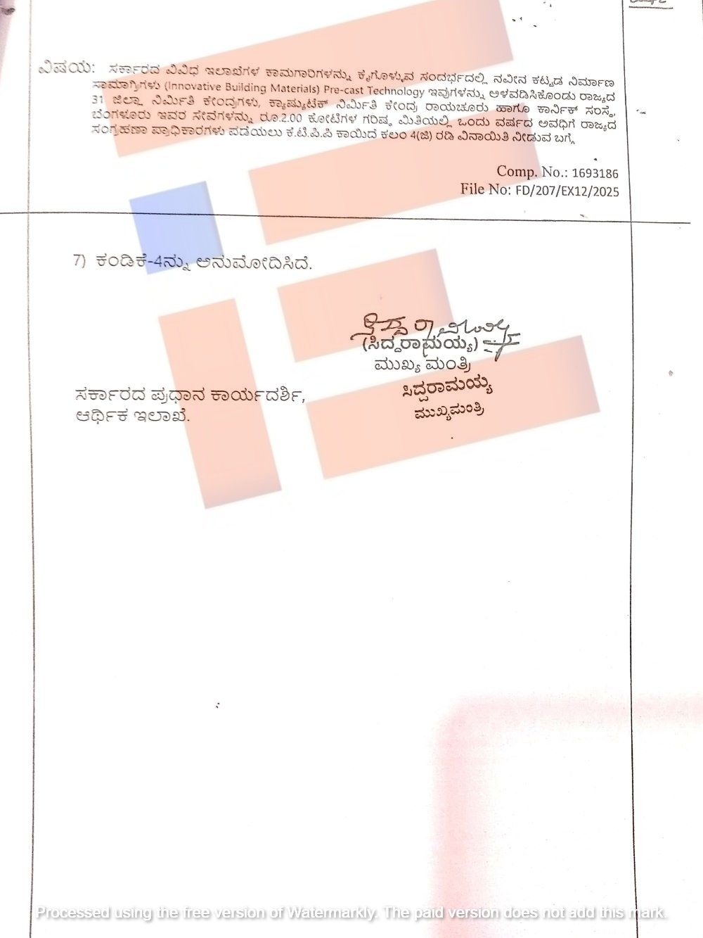 ಆದರೂ ವಸತಿ ಇಲಾಖೆಯ ಸಚಿವ ಬಿ ಝಡ್ ಜಮೀರ್ ಅಹ್ಮದ್ ಖಾನ್ ಅವರ ಒತ್ತಡ ಮೇರೆಗೆ ಮುಖ್ಯಮಂತ್ರಿ ಸಿದ್ದರಾಮಯ್ಯ ಅವರು ನಿರ್ಮಿತಿ ಕೇಂದ್ರಗಳಿಗೆ 4 (ಜಿ) ವಿನಾಯಿತಿ ನೀಡಿ ಅಧಿಸೂಚನೆ ಹೊರಡಿಸಲು ಅನುಮೋದನೆ ನೀಡಿರುವುದು ಗೊತ್ತಾಗಿದೆ.