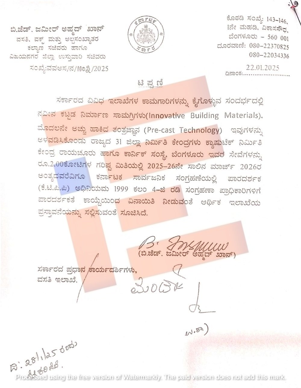 ಸರ್ಕಾರದ ವಿವಿಧ ಇಲಾಖೆಗಳ ಕಾಮಗಾರಿಗಳನ್ನು ಕೈಗೊಳ್ಳುವ ಸಂದರ್ಭದಲ್ಲಿ ನವೀನ ಕಟ್ಟಡ ನಿರ್ಮಾಣ ಸಾಮಗ್ರಿಗಳು, ಮೊದಲನೇ ಅಚ್ಚು ಹಾಕಿದ ತಂತ್ರಜ್ಞಾನಗಳನ್ನು ಅಳವಡಿಸಿಕೊಂಡು ರಾಜ್ಯದ 31 ಜಿಲ್ಲಾ ನಿರ್ಮಿತಿ ಕೇಂದ್ರಗಳು ಕ್ಯಾಷುಟೆಕ್ ನಿರ್ಮಿತಿ ಕೇಂದ್ರ ಹಾಗೂ ಕಾರ್ನಿಕ್ ಸಂಸ್ಥೆಯ ಸೇವೆಗಳನ್ನು 2.00 ಕೋಟಿ ರು. ಗರಿಷ್ಠ ಮಿತಿಯಲ್ಲಿ ಕೈಗೊಳ್ಳಬೇಕಿದೆ. 2025-26ಏ ಸಾಲಿನ ಮಾರ್ಚ್ 2026ರ ಅಂತ್ಯದವರೆಗೂ ಕರ್ನಾಟಕ ಸಾರ್ವಜನಿಕ ಸಂಗ್ರಹಣೆಗಳಲ್ಲಿ ಪಾರದರ್ಶಕ ಅಧಿನಿಯಮ 1999 ಕಲಂ 4-ಜಿ ವಿನಾಯಿತಿ ನೀಡುವಂತೆ ಆರ್ಥಿಕ ಇಲಾಖೆಗೆ ಪ್ರಸ್ತಾವನೆ ಸಲ್ಲಿಸಬೇಕು ಎಂದು ಸಚಿವ ಜಮೀರ್ ಅಹ್ಮದ್ ಖಾನ್ ಅವರು ಟಿಪ್ಪಣಿಯಲ್ಲಿ ಸೂಚಿಸಿದ್ದರು.