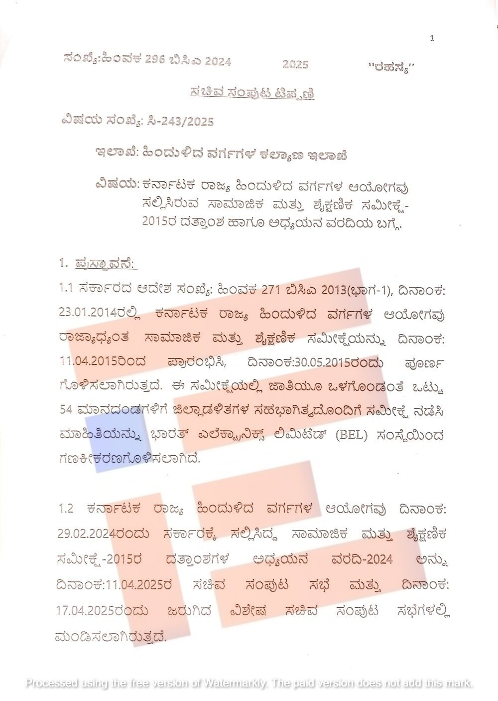 ಸಾಮಾಜಿಕ ಮತ್ತು ಶೈಕ್ಷಣಿಕ ಸಮೀಕ್ಷೆ 2015ರ ದತ್ತಾಂಶಗಳ ಅಧ್ಯಯನ ವರದಿ ಕುರಿತು ಸಚಿವ ಸಂಪುಟದ ಮುಂದುವರೆದ ಸಭೆಗೆ ಇಲಾಖೆಯು ಮಂಡಿಸಿರುವ ವಿವರಣೆಗಳಲ್ಲಿ ಈ ಕುರಿತು ಮಾಹಿತಿಯನ್ನು ಒದಗಿಸಿದೆ. ಇಲಾಖೆಯು ಸಚಿವ ಸಂಪುಟಕ್ಕೆ ಒದಗಿಸಿರುವ ಈ ವಿವರಣೆಯು ‘ದಿ ಫೈಲ್’ಗೆ ಲಭ್ಯವಾಗಿದೆ.