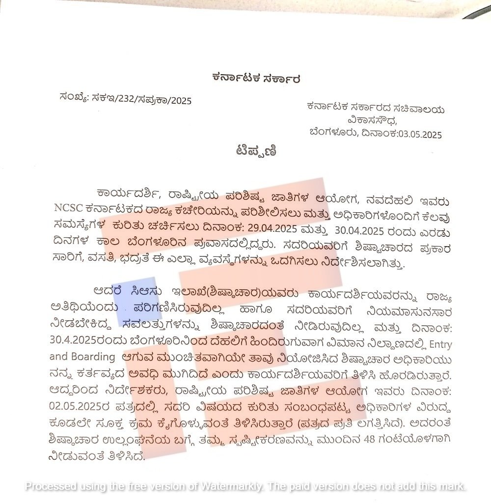 ರಾಷ್ಟ್ರೀಯ ಪರಿಶಿಷ್ಟ ಜಾತಿಗಳ ಆಯೋಗದ ಕಾರ್ಯದರ್ಶಿಯು 2025ರ 29 ಮತ್ತು 30ರಂದು ಬೆಂಗಳೂರು ಪ್ರವಾಸದಲ್ಲಿದ್ದರು. ಈ ಎರಡೂ ದಿನಗಳ ಕಾಲ ಅವರಿಗೆ ಶಿಷ್ಟಾಚಾರದ ಪ್ರಕಾರ ಸಾರಿಗೆ, ವಸತಿ, ಭದ್ರತೆ ಸೇರಿದಂತೆ ಇನ್ನಿತರೆ ವ್ಯವಸ್ಥೆಗಳನ್ನು ಒದಗಿಸಲು ನಿರ್ದೇಶಿಸಿತ್ತು. ಶಿಷ್ಟಾಚಾರದ ಪ್ರಕಾರ ಈ ಎಲ್ಲಾ ಸವಲತ್ತುಗಳನ್ನು ಒದಗಿಸಬೇಕಿದ್ದ ಶಿಷ್ಟಾಚಾರದ ಅಧಿಕಾರಿಗಳು ಒದಗಿಸಿಲ್ಲ ಎಂಬುದು ಪತ್ರದಿಂದ ಗೊತ್ತಾಗಿದೆ.