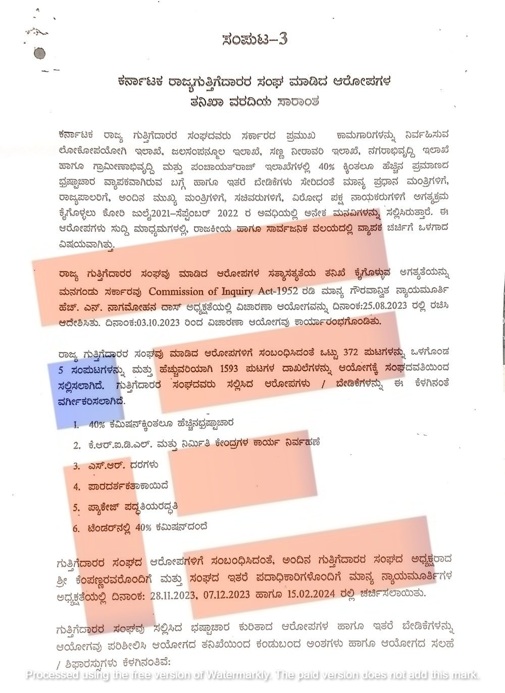 ರಾಜ್ಯ ಗುತ್ತಿಗೆದಾರರ ಸಂಘವು ಮಾಡಿದ್ದ ಶೇ.40ರಷ್ಟು ಕಮಿಷನ್ ಆರೋಪಕ್ಕೆ ಸಂಬಂಧಿಸಿದಂತೆ ವಿಚಾರಣೆ ನಡೆಸಿದ್ದ ವಿಚಾರಣೆ ಆಯೋಗವು 372 ಪುಟಗಳನ್ನು ಒಳಗೊಂಡ 5 ಸಂಪುಟ ಮತ್ತು ಹೆಚ್ಚುವರಿಯಾಗಿ 1,593 ಪುಟಗಳ ದಾಖಲೆಗಳನ್ನು ಪರಾಮರ್ಶಿಸಿತ್ತು.