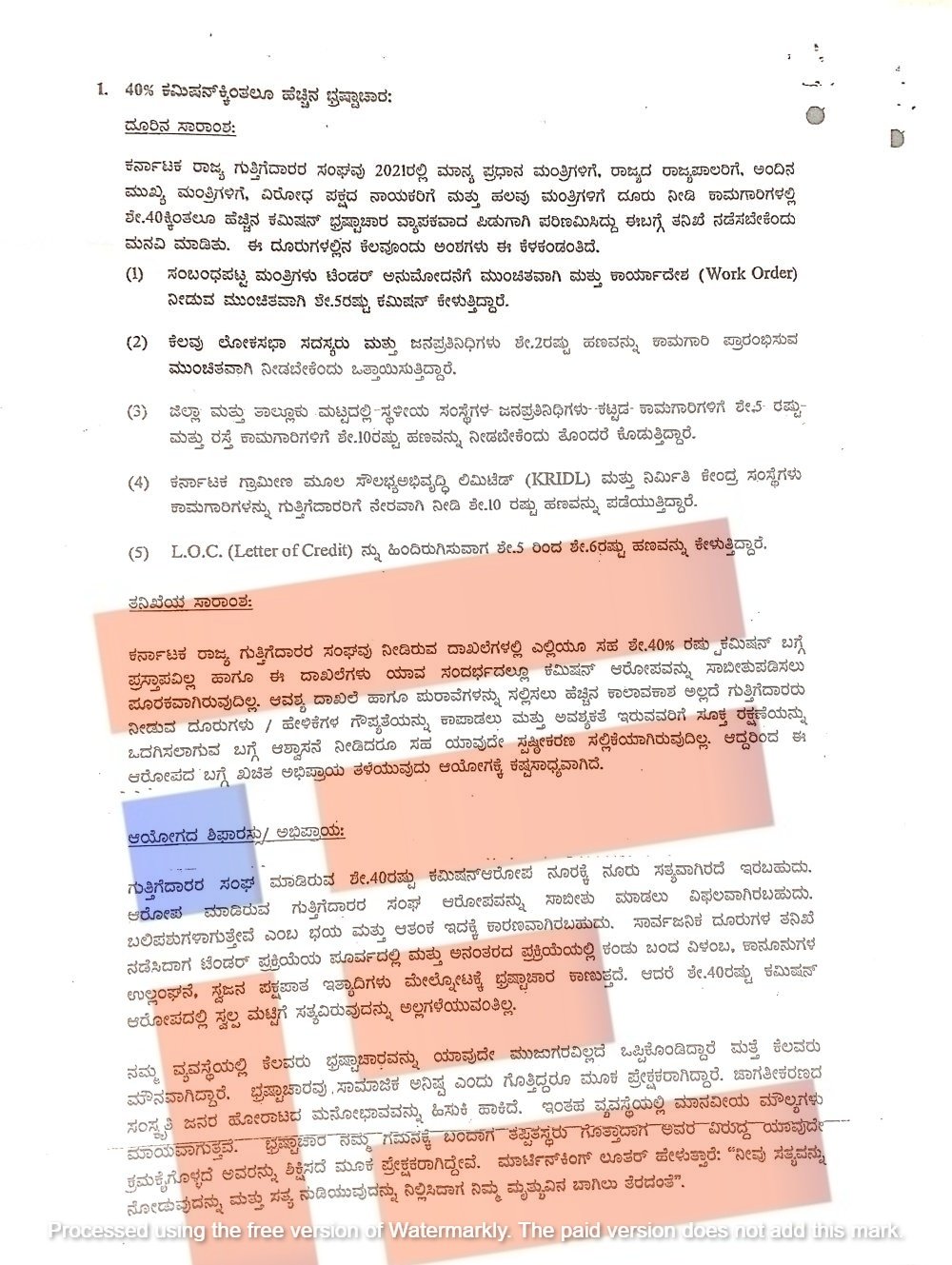 ಸಾರ್ವಜನಿಕ ದೂರುಗಳ ತನಿಖೆ ನಡೆಸಿದಾಗ ಟೆಂಡರ್ ಪ್ರಕ್ರಿಯೆಯ ಪೂರ್ವದಲ್ಲಿ ಮತ್ತು ಆನಂತರದ ಪ್ರಕ್ರಿಯೆಯಲ್ಲಿ ಕಂಡು ಬಂದ ವಿಳಂಬ, ಕಾನೂನುಗಳ ಉಲ್ಲಂಘನೆ, ಸ್ವಜನಪಕ್ಷಪಾತ ಇತ್ಯಾದಿಗಳು ಮೇಲ್ನೋಟಕ್ಕೆ ಭ್ರಷ್ಟಾಚಾರ ಕಾಣುತ್ತದೆ. ಆದರೆ ಶೇ. 40ರಷ್ಟು ಕಮಿಷನ್ ಆರೋಪದಲ್ಲಿ ಸ್ವಲ್ಪ ಮಟ್ಟಿಗೆ ಸತ್ಯವಿರುವುದನ್ನು ಅಲ್ಲಗಳೆಯುವಂತಿಲ್ಲ ಎಂದು ವರದಿಯಲ್ಲಿ ಅಭಿಪ್ರಾಯಿಸಿರುವುದು ತಿಳಿದು ಬಂದಿದೆ.