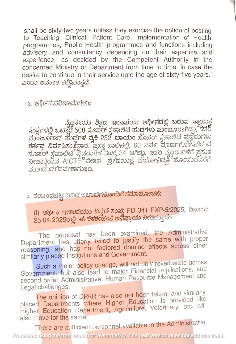 ಬೆಂಗಳೂರು; ವೈದ್ಯಕೀಯ ಶಿಕ್ಷಣ ಇಲಾಖೆಯಲ್ಲಿ ಕರ್ತವ್ಯ ನಿರ್ವಹಿಸುತ್ತಿರುವ ಸೂಪರ್‍‌ ಸ್ಪೆಷಾಲಿಟಿ ವೈದ್ಯರುಗಳ ವಯೋ ನಿವೃತ್ತಿಯನ್ನು 60ರಿಂದ 65ಕ್ಕೆ ಹೆಚ್ಚಿಸಲು ಆರ್ಥಿಕ ಇಲಾಖೆಯು ಸುತರಾಂ ಒಪ್ಪಿಲ್ಲ. ಅಲ್ಲದೇ ಇದು ಆರ್ಥಿಕ ಪರಿಣಾಮಗಳಿಗೆ ದಾರಿ ಮಾಡಿಕೊಡುತ್ತದೆ, ಇಂತಹ ಪ್ರಸ್ತಾವನೆಯನ್ನು ಮುಂದುವರೆಸಬಾರದು ಎಂದು ಕಟ್ಟುನಿಟ್ಟಾಗಿ ಅಭಿಪ್ರಾಯಿಸಿದ್ದರೂ ಸಹ ವೈದ್ಯಕೀಯ ಶಿಕ್ಷಣ ಇಲಾಖೆಯ ಪ್ರಸ್ತಾವನೆಯನ್ನು ಸಚಿವ ಸಂಪುಟವು ಅನುಮೋದಿಸಿದೆ.