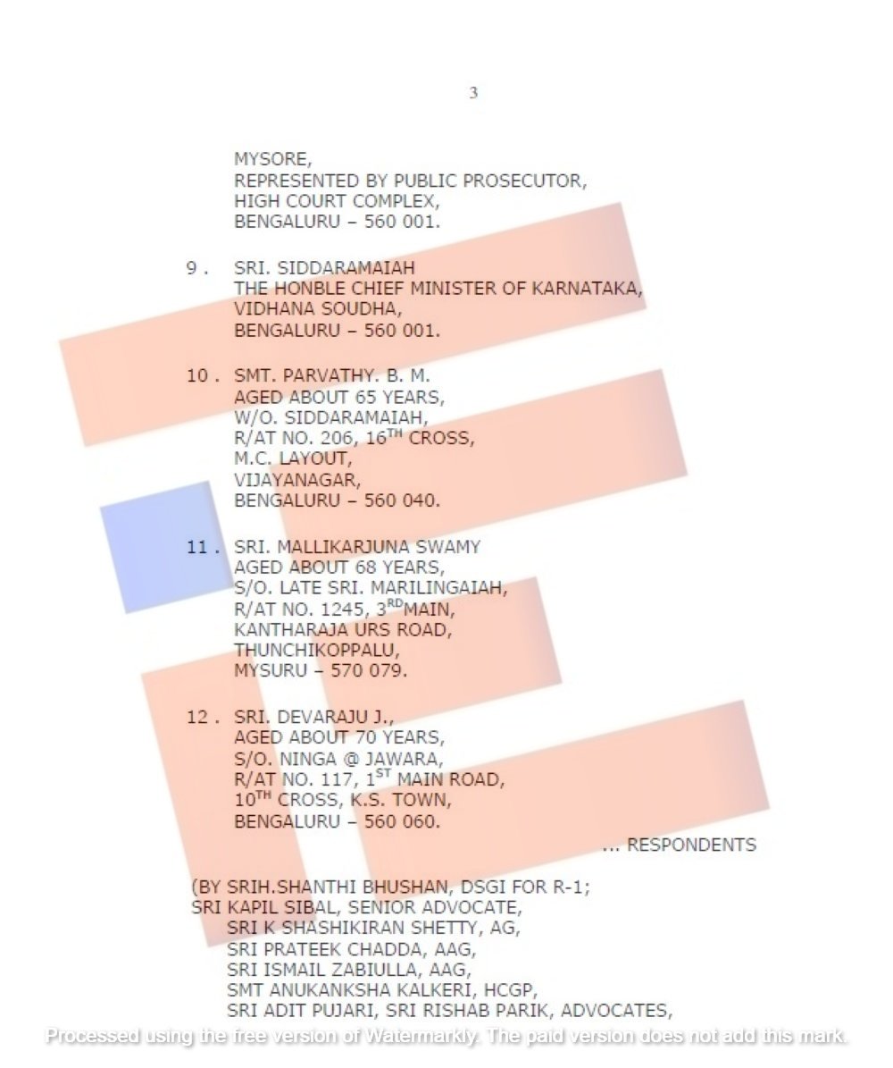 ಈ ಅರ್ಜಿಯಲ್ಲಿ ಸಿದ್ದರಾಮಯ್ಯ ಅವರನ್ನು 9ನೇ ಮತ್ತು ಅವರ ಪತ್ನಿ ಪಾರ್ವತಿ ಅವರನ್ನು 10ನೇ ಪ್ರತಿವಾದಿಯನ್ನಾಗಿಸಿದ್ದರು.